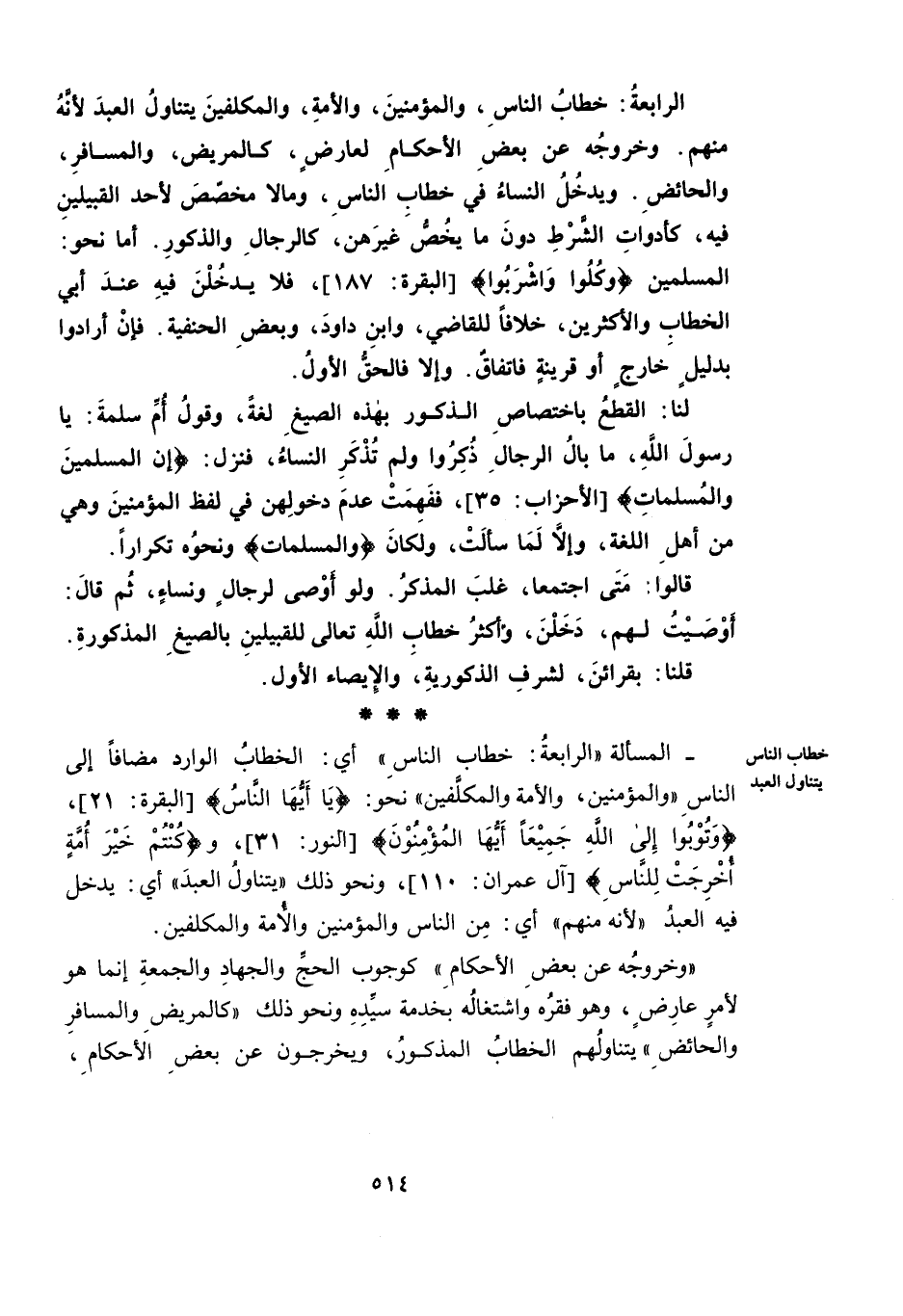 الرَّابِعَةُ: خِطَابُ النَّاسِ، وَالْمُؤْمِنِينَ، وَالْأُمَّةِ، وَالْمُكَلَّفِينَ يَتَنَاوَلُ الْعَبْدَ لِأَنَّهُ مِنْهُمْ. وَخُرُوجُهُ عَنْ بَعْضِ الْأَحْكَامِ لِعَارِضٍ، كَالْمَرِيضِ، وَالْمُسَافِرِ، وَالْحَائِضِ. وَيَدْخُلُ النِّسَاءُ فِي خِطَابِ النَّاسِ، وَمَا لَا مُخَصِّصَ لِأَحَدِ الْقَبِيلَيْنِ فِيهِ، كَأَدَوَاتِ الشَّرْطِ دُونَ مَا يَخُصُّ غَيْرَهُنَّ، كَالرِّجَالِ وَالذُّكُورِ. أَمَّا نَحْوُ: الْمُسْلِمِينَ، وَكُلُوا وَاشْرَبُوا [الْبَقَرَةِ: 187] ; فَلَا يَدْخُلْنَ فِيهِ عِنْدَ أَبِي الْخَطَّابِ وَالْأَكْثَرِينَ، خِلَافًا لِلْقَاضِي، وَابْنِ دَاوُدَ، وَبَعْضِ الْحَنَفِيَّةِ، فَإِنْ أَرَادُوا بِدَلِيلٍ خَارِجٍ أَوْ قَرِينَةٍ فَاتِّفَاقٌ. وَإِلَّا فَالْحَقُّ الْأَوَّلُ.