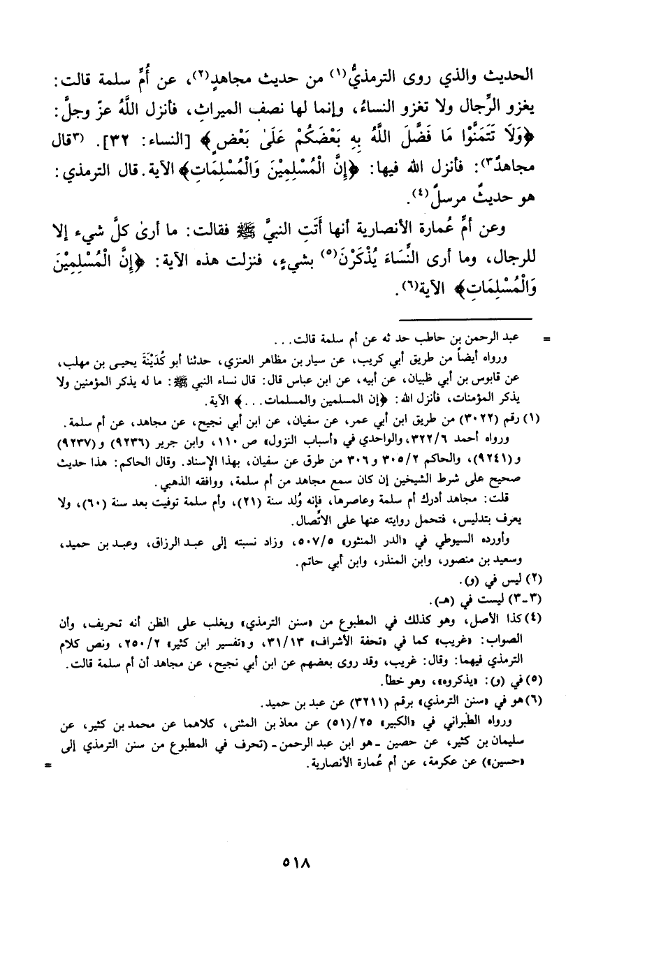 الْحَدِيثِ وَالَّذِي رَوَى التِّرْمِذِيُّ، مِنْ حَدِيثِ مُجَاهِدٍ، عَنْ أُمِّ سَلَمَةَ قَالَتْ: يَغْزُو الرِّجَالُ وَلَا تَغْزُو النِّسَاءُ، وَإِنَّمَا لَهَا نِصْفُ الْمِيرَاثِ ; فَأَنْزَلَ اللَّهُ عَزَّ وَجَلَّ: {وَلَا تَتَمَنَّوْا مَا فَضَّلَ اللَّهُ بِهِ بَعْضَكُمْ عَلَى بَعْضٍ} [النِّسَاءِ: 32] ، قَالَ مُجَاهِدٌ: فَأَنْزَلَ اللَّهُ فِيهَا: {إِنَّ الْمُسْلِمِينَ وَالْمُسْلِمَاتِ} الْآيَةَ، قَالَ التِّرْمِذِيُّ: هُوَ حَدِيثٌ مُرْسَلٌ. وَعَنْ أُمِّ عُمَارَةَ الْأَنْصَارِيَّةِ أَنَّهَا أَتَتِ النَّبِيَّ صَلَّى اللَّهُ عَلَيْهِ وَسَلَّمَ ; فَقَالَتْ: مَا أَرَى كُلَّ شَيْءٍ إِلَّا لِلرِّجَالِ، وَمَا أَرَى النِّسَاءَ يُذْكَرْنَ بِشَيْءٍ ; فَنَزَلَتْ هَذِهِ الْآيَةُ: {إِنَّ الْمُسْلِمِينَ وَالْمُسْلِمَاتِ} الْآيَةَ.