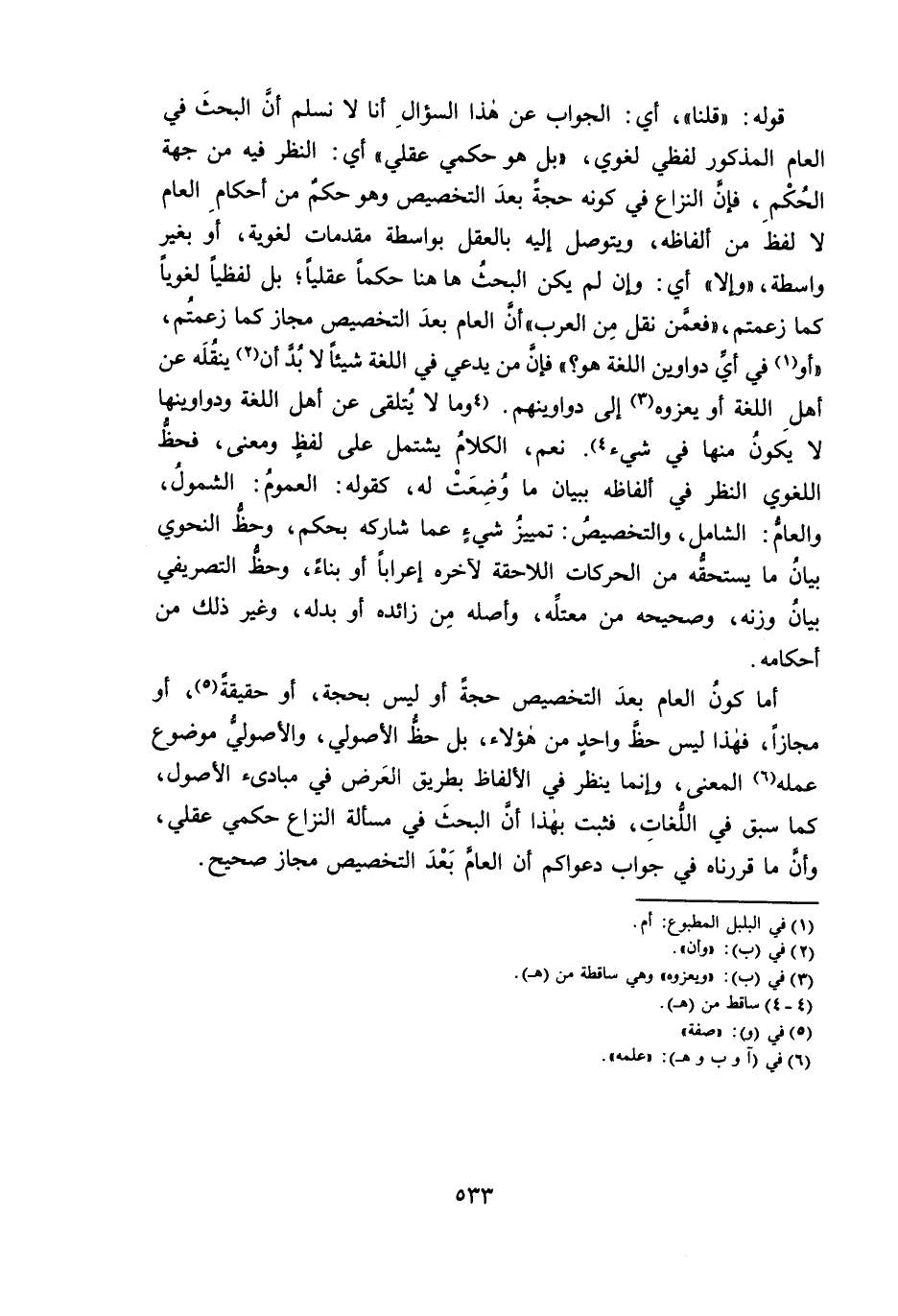 أَمَّا كَوْنُ الْعَامِّ بَعْدَ التَّخْصِيصِ حُجَّةً أَوْ لَيْسَ بِحُجَّةٍ، أَوْ حَقِيقَةً، أَوْ مَجَازًا ; فَهَذَا لَيْسَ حَظَّ وَاحِدٍ مِنْ هَؤُلَاءِ، بَلْ حَظُّ الْأُصُولِيِّ، وَالْأُصُولِيُّ مَوْضُوعُ عَمَلِهِ الْمَعْنَى، وَإِنَّمَا يَنْظُرُ فِي الْأَلْفَاظِ بِطَرِيقِ الْعَرَضِ فِي مَبَادِئِ الْأُصُولِ، كَمَا سَبَقَ فِي اللُّغَاتِ ; فَثَبَتَ بِهَذَا أَنَّ الْبَحْثَ فِي مَسْأَلَةِ النِّزَاعِ حُكْمِيٌّ عَقْلِيٌّ، وَأَنَّ مَا قَرَّرْنَاهُ فِي جَوَابِ دَعْوَاكُمْ أَنَّ الْعَامَّ بَعْدَ التَّخْصِيصِ مَجَازٌ صَحِيحٌ.