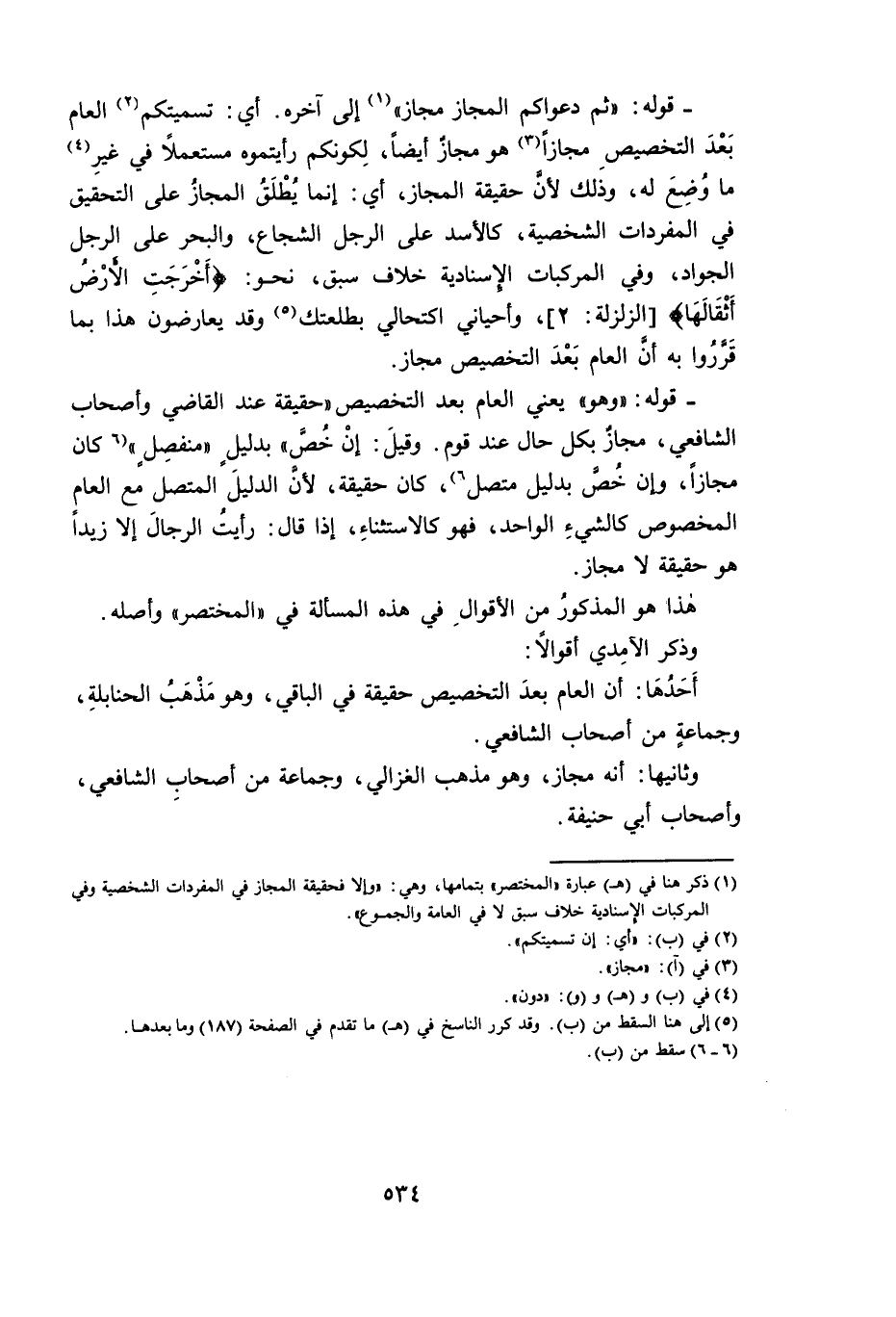 قَوْلُهُ: «ثُمَّ دَعْوَاكُمُ الْمَجَازَ مَجَازٌ» إِلَى آخِرِهِ، أَيْ: تَسْمِيَتُكُمُ الْعَامَّ بَعْدَ التَّخْصِيصِ مَجَازًا هُوَ مُجَازٌ أَيْضًا، لِكَوْنِكُمْ رَأَيْتُمُوهُ مُسْتَعْمَلًا فِي غَيْرِ مَا وُضِعَ لَهُ، وَذَلِكَ لِأَنَّ حَقِيقَةَ الْمَجَازِ، أَيْ: إِنَّمَا يُطْلَقُ الْمَجَازُ عَلَى التَّحْقِيقِ فِي الْمُفْرَدَاتِ الشَّخْصِيَّةِ، كَالْأَسَدِ عَلَى الرَّجُلِ الشُّجَاعِ، وَالْبَحْرِ عَلَى الرَّجُلِ الْجَوَّادِ، وَفِي الْمُرَكَّبَاتِ الْإِسْنَادِيَّةِ خِلَافٌ سَبَقَ، نَحْوَ: {وَأَخْرَجَتِ الْأَرْضُ أَثْقَالَهَا} [الزَّلْزَلَةِ: 2] ، وَأَحْيَانِي اكْتِحَالِي بِطَلْعَتِكَ، وَقَدْ يُعَارِضُونَ هَذَا بِمَا قَرَّرُوا بِهِ أَنَّ الْعَامَّ بَعْدَ التَّخْصِيصِ مَجَازٌ.