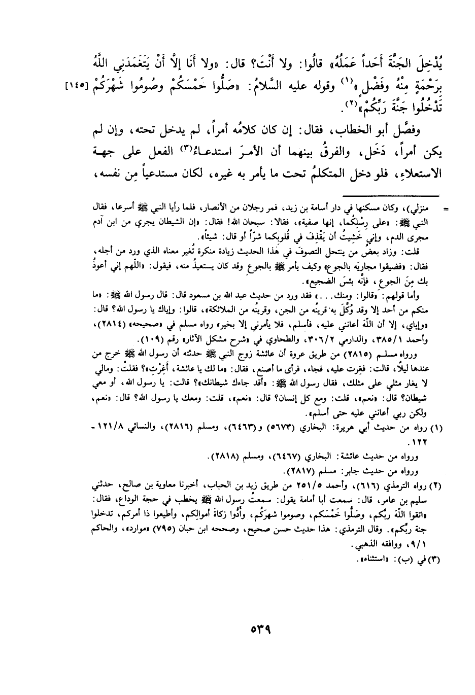 يُدْخِلَ الْجَنَّةَ أَحَدًا عَمَلُهُ، قَالُوا: وَلَا أَنْتَ؟ قَالَ: وَلَا أَنَا إِلَّا أَنْ يَتَغَمَّدَنِي اللَّهُ بِرَحْمَةٍ مِنْهُ وَفَضْلٍ. وَقَوْلُهُ عَلَيْهِ السَّلَامُ: صَلُّوا خَمْسَكُمْ وَصُومُوا شَهْرَكُمْ تَدْخُلُوا جَنَّةَ رَبِّكُمْ.