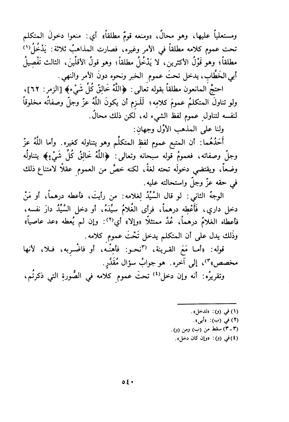 احْتَجَّ الْمَانِعُونَ مُطْلَقًا بِقَوْلِهِ تَعَالَى: {اللَّهُ خَالِقُ كُلِّ شَيْءٍ} [الزُّمَرِ: 62] ، وَلَوْ تَنَاوُلَ الْمُتَكَلِّمَ عُمُومُ كَلَامِهِ، لَلَزِمَ أَنْ يَكُونَ اللَّهُ عَزَّ وَجَلَّ وَصِفَاتُهُ مَخْلُوقًا لِنَفْسِهِ لِتَنَاوُلِ عُمُومِ لَفْظِ الشَّيْءِ لَهُ، لَكِنَّ ذَلِكَ مُحَالٌ.