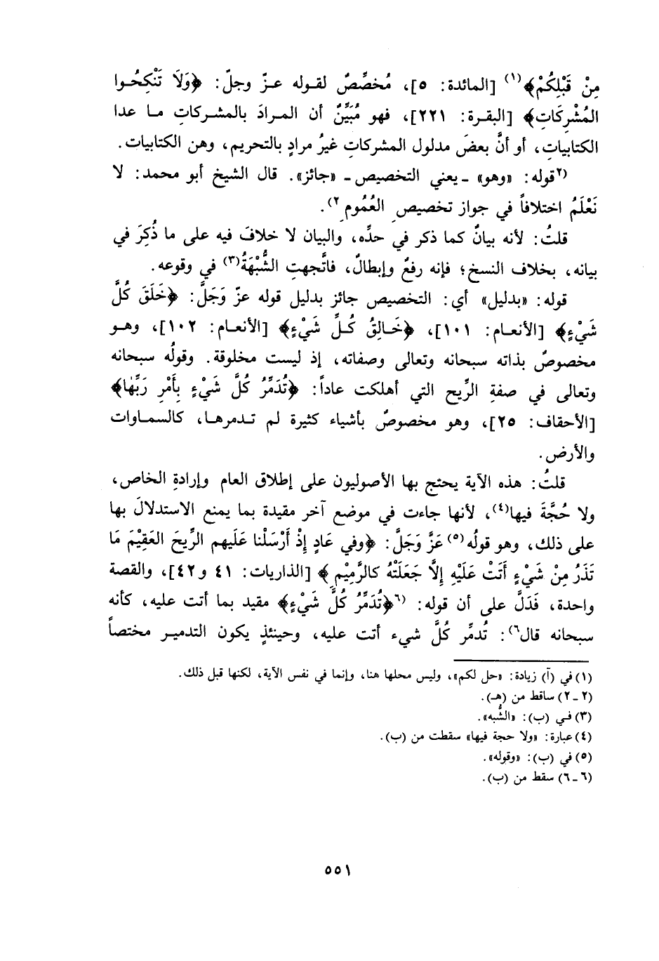 قَوْلُهُ: «بِدَلِيلِ» ، أَيِ: التَّخْصِيصُ جَائِزٌ بِدَلِيلِ قَوْلِهِ عَزَّ وَجَلَّ: {وَخَلَقَ كُلَّ شَيْءٍ} [الْأَنْعَامِ: 101] ، {خَالِقُ كُلِّ شَيْءٍ} [الْأَنْعَامِ: 102] ، وَهُوَ مَخْصُوصٌ بِذَاتِهِ سُبْحَانَهُ وَتَعَالَى وَصِفَاتِهِ، إِذْ لَيْسَتْ مَخْلُوقَةً. وَقَوْلِهِ سُبْحَانَهُ وَتَعَالَى فِي صِفَةِ الرِّيحِ الَّتِي أَهْلَكَتْ عَادًا: {تُدَمِّرُ كُلَّ شَيْءٍ بِأَمْرِ رَبِّهَا} [الْأَحْقَافِ: 25] ، وَهُوَ مَخْصُوصٌ بِأَشْيَاءَ كَثِيرَةٍ لَمْ تُدَمِّرْهَا، كَالسَّمَاوَاتِ وَالْأَرْضِ.