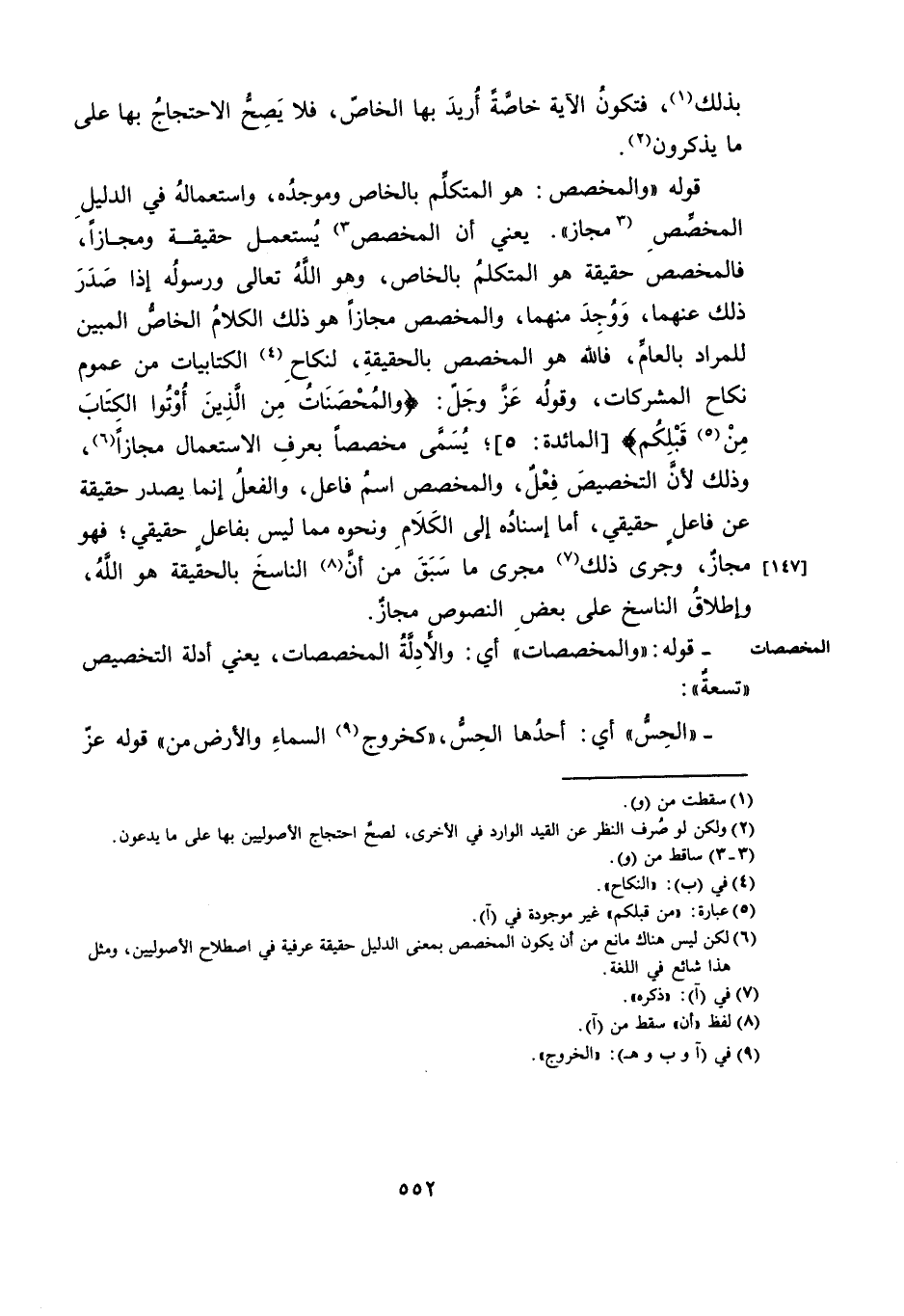 قَوْلُهُ: «وَالْمُخَصِّصَاتُ» ، أَيْ: وَالْأَدِلَّةُ الْمُخَصِّصَاتُ، يَعْنِي أَدِلَّةَ التَّخْصِيصِ «تِسْعَةٌ» :