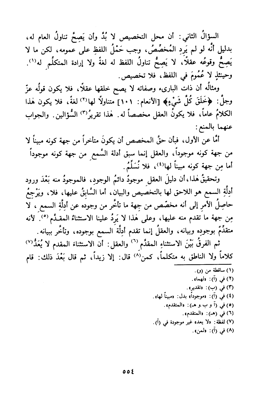 أَمَّا عَنِ الْأَوَّلِ ; فَبِأَنَّ حَقَّ الْمُخَصِّصِ أَنْ يَكُونَ مُتَأَخِّرًا مِنْ جِهَةِ كَوْنِهِ مُبَيِّنًا لَا مِنْ جِهَةِ كَوْنِهِ مَوْجُودًا، وَالْعَقْلُ إِنَّمَا سَبَقَ أَدِلَّةَ السَّمْعِ مِنْ جِهَةِ كَوْنِهِ مَوْجُودًا. أَمَّا مِنْ جِهَةِ كَوْنِهِ مُبَيِّنًا لَهَا ; فَلَا نُسَلِّمُ.