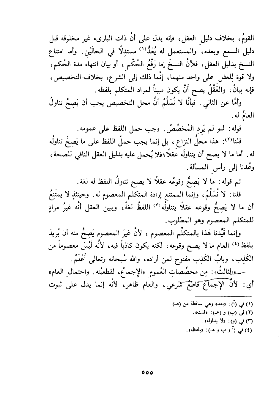 الْقَوْمُ، بِخِلَافِ دَلِيلِ الْعَقْلِ ; فَإِنَّهُ يَدُلُّ عَلَى أَنَّ ذَاتَ الْبَارِئِ غَيْرُ مَخْلُوقَةٍ قَبْلَ دَلِيلِ السَّمْعِ وَبَعْدَهُ، وَالْمُسْتَعْمِلُ لَهُ يُعَدُّ مُسْتَدِلًّا فِي الْحَالَيْنِ. وَأَمَّا امْتِنَاعُ النَّسْخِ بِدَلِيلِ الْعَقْلِ ; فَلِأَنَّ النَّسْخَ إِمَّا رَفْعُ الْحُكْمِ، أَوْ بَيَانُ انْتِهَاءِ مُدَّةِ الْحُكْمِ، وَلَا قُوَّةَ لِلْعَقْلِ عَلَى وَاحِدٍ مِنْهُمَا، إِنَّمَا ذَلِكَ إِلَى الشَّرْعِ، بِخِلَافِ التَّخْصِيصِ ; فَإِنَّهُ بَيَانٌ، وَالْعَقْلُ يَصِحُّ أَنْ يَكُونَ مُبَيِّنًا لِمُرَادِ الْمُتَكَلِّمِ بِلَفْظِهِ.