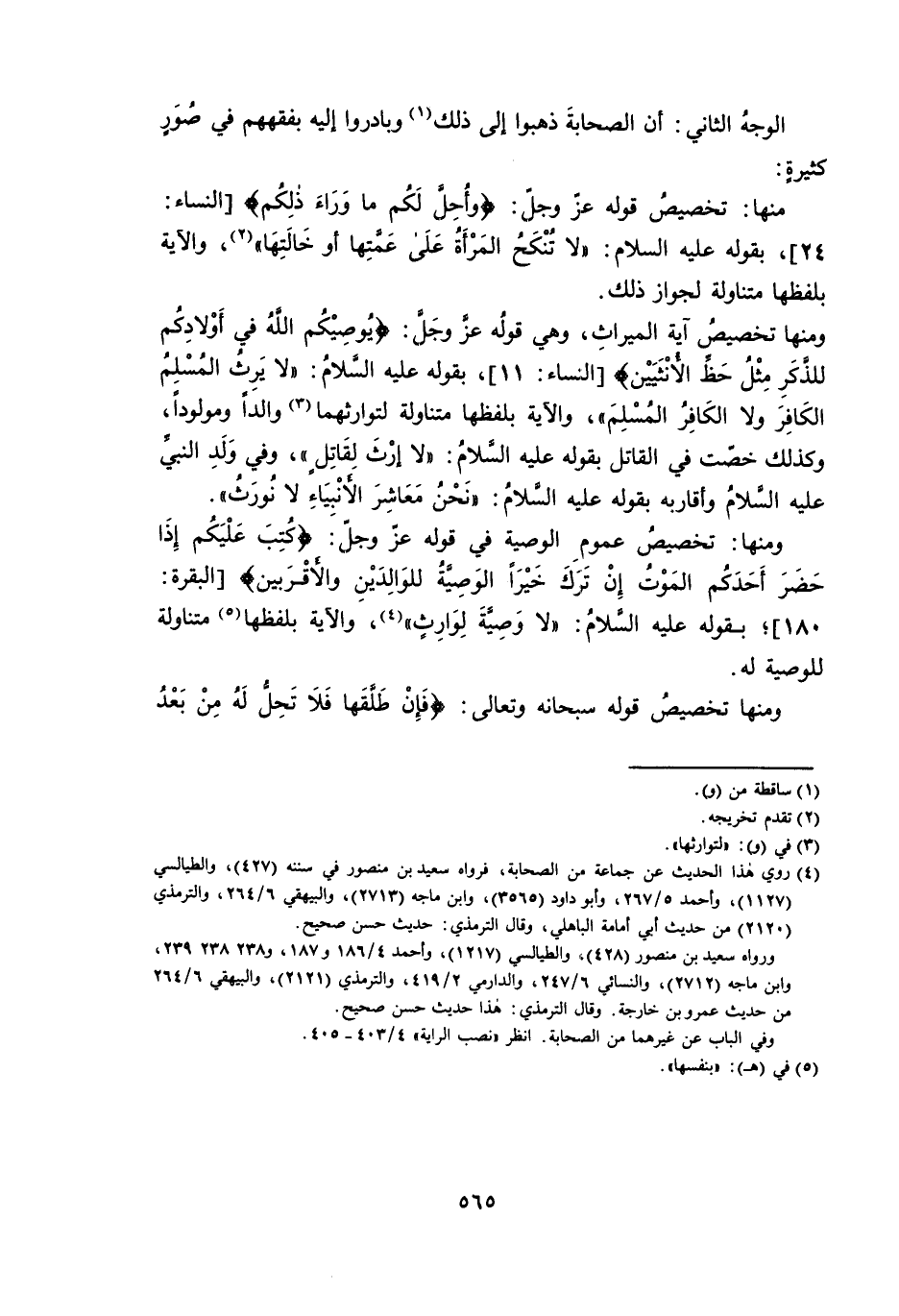 وَمِنْهَا تَخْصِيصُ آيَةِ الْمِيرَاثِ، وَهِيَ قَوْلُهُ عَزَّ وَجَلَّ: {يُوصِيكُمُ اللَّهُ فِي أَوْلَادِكُمْ لِلذَّكَرِ مِثْلُ حَظِّ الْأُنْثَيَيْنِ} [النِّسَاءِ: 11] ، بِقَوْلِهِ عَلَيْهِ السَّلَامُ: " لَا يَرِثُ الْمُسْلِمُ الْكَافِرَ، وَلَا الْكَافِرُ الْمُسْلِمَ ". وَالْآيَةُ بِلَفْظِهَا مُتَنَاوِلَةٌ لِتَوَارُثِهِمَا وَالِدًا وَمَوْلُودًا، وَكَذَلِكَ خَصَّتْ فِي الْقَاتِلِ بِقَوْلِهِ عَلَيْهِ السَّلَامُ: " لَا إِرْثَ لِقَاتِلٍ ". وَفِي وَلَدِ النَّبِيِّ عَلَيْهِ السَّلَامُ وَأَقَارِبِهِ بِقَوْلِهِ عَلَيْهِ السَّلَامُ: " نَحْنُ مَعَاشِرَ الْأَنْبِيَاءِ لَا نُورَثُ ".