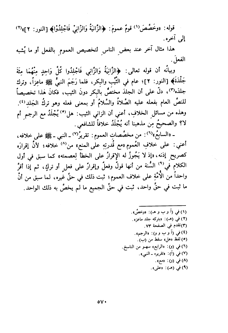 قَوْلُهُ: «وَخَصَّصَ قَوْمٌ عُمُومَ: {الزَّانِيَةُ وَالزَّانِي فَاجْلِدُوا} [النُّورِ: 2] » ، إِلَى آخِرِهِ.