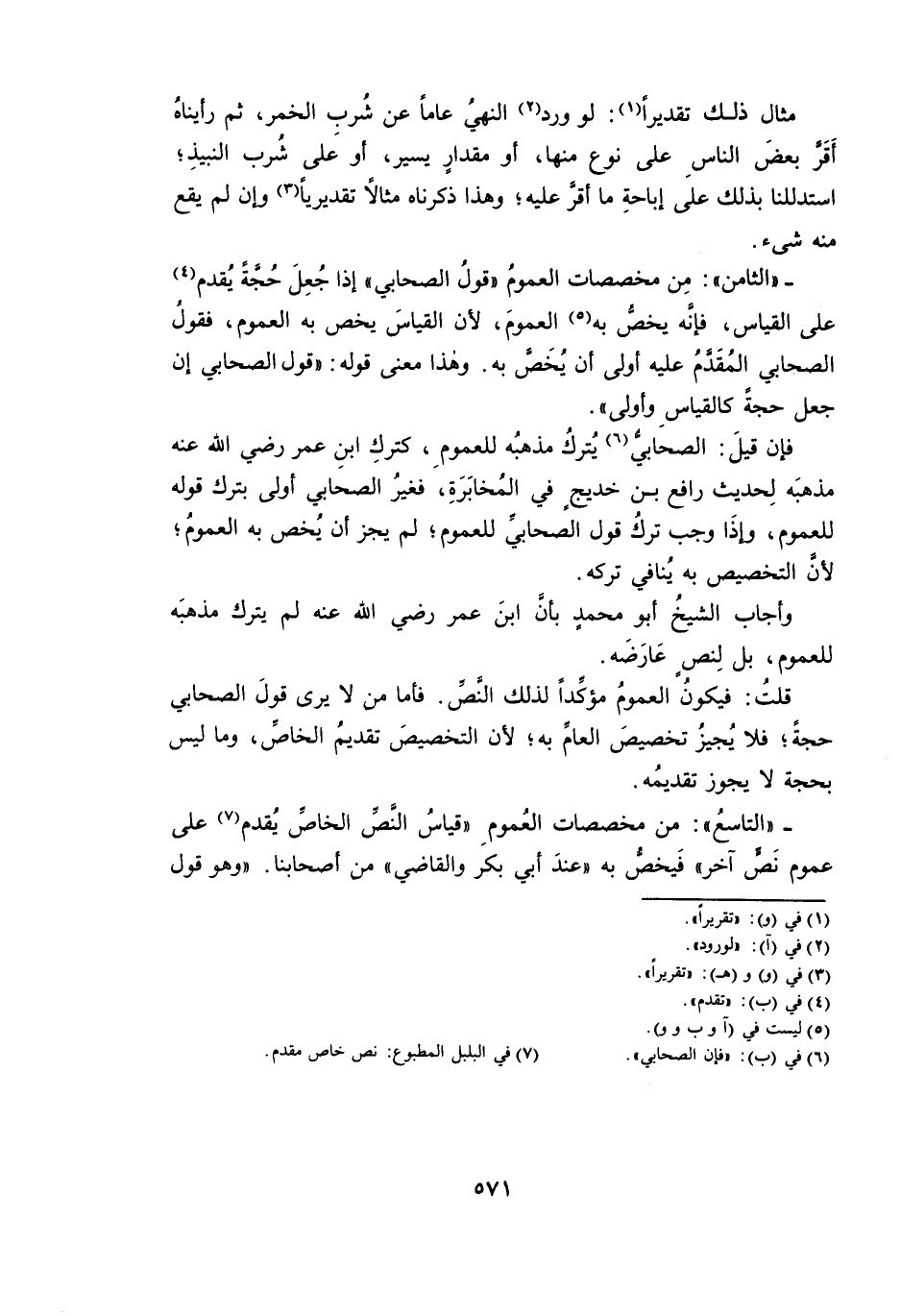 - «الثَّامِنُ» : مِنْ مُخَصِّصَاتِ الْعُمُومِ «قَوْلُ الصَّحَابِيِّ» إِذَا جُعِلَ حُجَّةً يُقَدَّمُ عَلَى الْقِيَاسِ ; فَإِنَّهُ يُخَصُّ بِهِ الْعُمُومُ ; لِأَنَّ الْقِيَاسَ يُخَصُّ بِهِ الْعُمُومُ ; فَقَوْلُ الصَّحَابِيِّ الْمُقَدَّمُ عَلَيْهِ أَوْلَى أَنْ يُخَصَّ بِهِ. وَهَذَا مَعْنَى قَوْلِهِ: «قَوْلُ الصَّحَابِيِّ إِنْ جُعِلَ حُجَّةً كَالْقِيَاسِ وَأَوْلَى» .