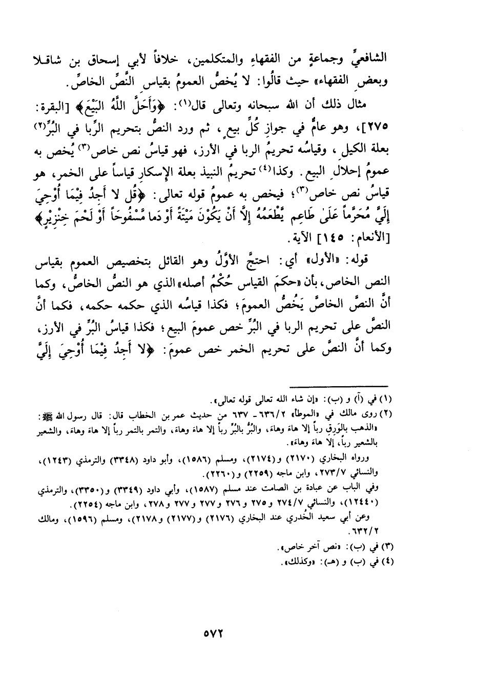 الشَّافِعِيِّ وَجَمَاعَةٍ مِنَ الْفُقَهَاءِ وَالْمُتَكَلِّمِينَ، خِلَافًا لِأَبِي إِسْحَاقَ بْنِ شَاقْلَا وَبَعْضِ الْفُقَهَاءِ» ، حَيْثُ قَالُوا: لَا يُخَصُّ الْعُمُومُ بِقِيَاسِ النَّصِّ الْخَاصِّ.