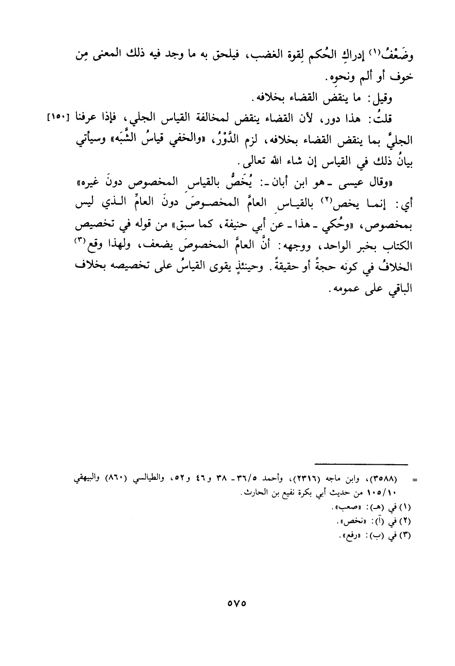 «وَقَالَ عِيسَى، - هُوَ ابْنُ أَبَانَ -: يُخَصُّ بِالْقِيَاسِ الْمَخْصُوصُ دُونَ غَيْرِهِ» ، أَيْ: إِنَّمَا يُخَصُّ بِالْقِيَاسِ الْعَامُّ الْمَخْصُوصُ دُونَ الْعَامِّ الَّذِي لَيْسَ بِمَخْصُوصٍ، «وَحُكِيَ - هَذَا - عَنْ أَبِي حَنِيفَةَ، كَمَا سَبَقَ» مِنْ قَوْلِهِ فِي تَخْصِيصِ الْكِتَابِ بِخَبَرِ الْوَاحِدِ، وَوَجْهُهُ: أَنَّ الْعَامَّ الْمَخْصُوصَ يُضَعَّفُ، وَلِهَذَا وَقَعَ الْخِلَافُ فِي كَوْنِهِ حُجَّةً أَوْ حَقِيقَةً. وَحِينَئِذٍ يَقْوَى الْقِيَاسُ عَلَى تَخْصِيصِهِ بِخِلَافِ الْبَاقِي عَلَى عُمُومِهِ.