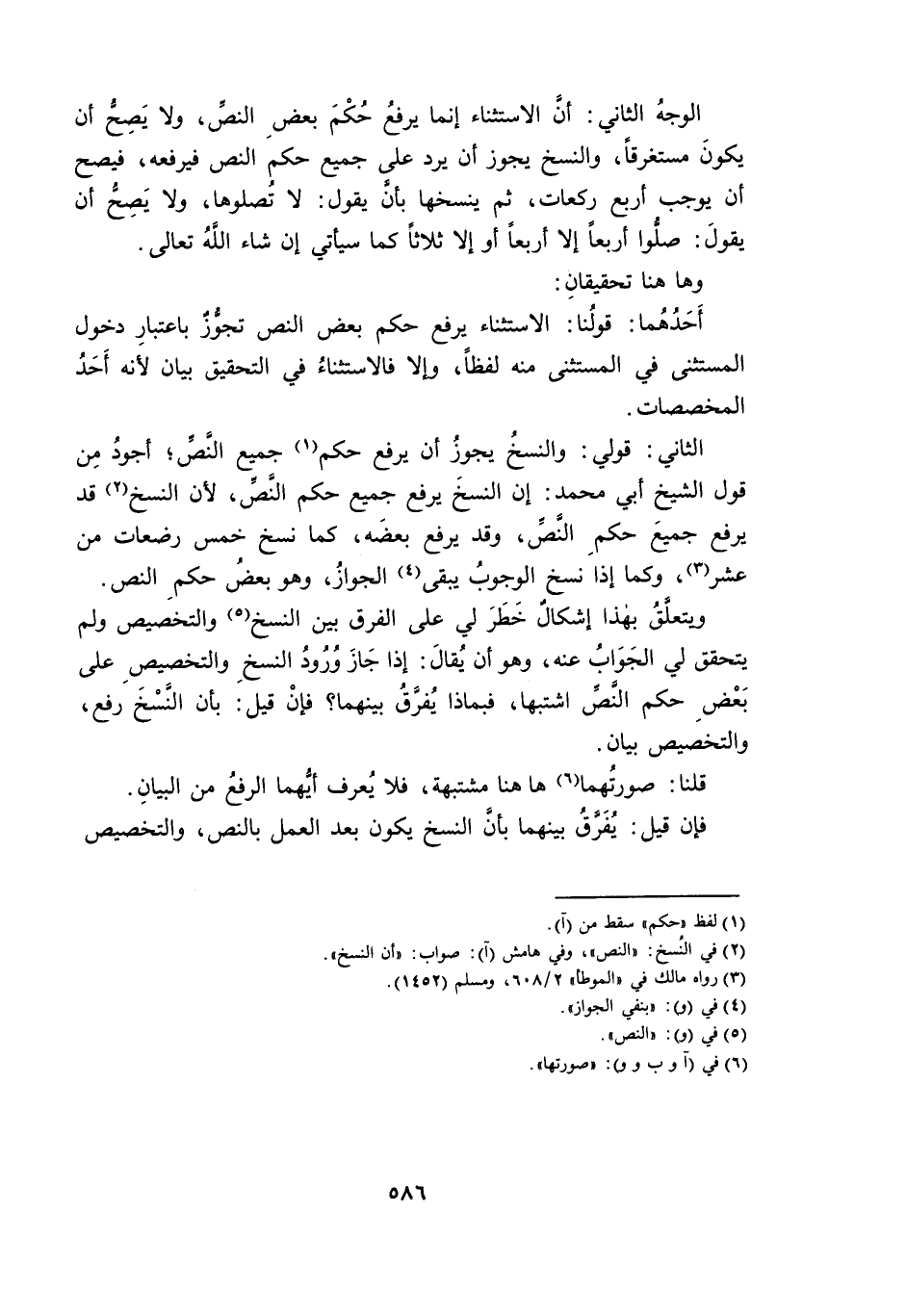 الثَّانِي: قَوْلِي: وَالنَّسْخُ يَجُوزُ أَنْ يَرْفَعَ حُكْمَ جَمِيعِ النَّصِّ، أَجْوَدُ مِنْ قَوْلِ الشَّيْخِ أَبِي مُحَمَّدٍ: إِنَّ النَّسْخَ يَرْفَعُ جَمِيعَ حُكْمِ النَّصِّ ; لِأَنَّ النَّسْخَ قَدْ يَرْفَعُ جَمِيعَ حُكْمِ النَّصِّ، وَقَدْ يَرْفَعُ بَعْضَهُ، كَمَا نُسِخَ خَمْسُ رَضَعَاتٍ مِنْ عَشْرِ، وَكَمَا إِذَا نُسِخَ الْوُجُوبُ يَبْقَى الْجَوَازُ، وَهُوَ بَعْضُ حُكْمِ النَّصِّ.