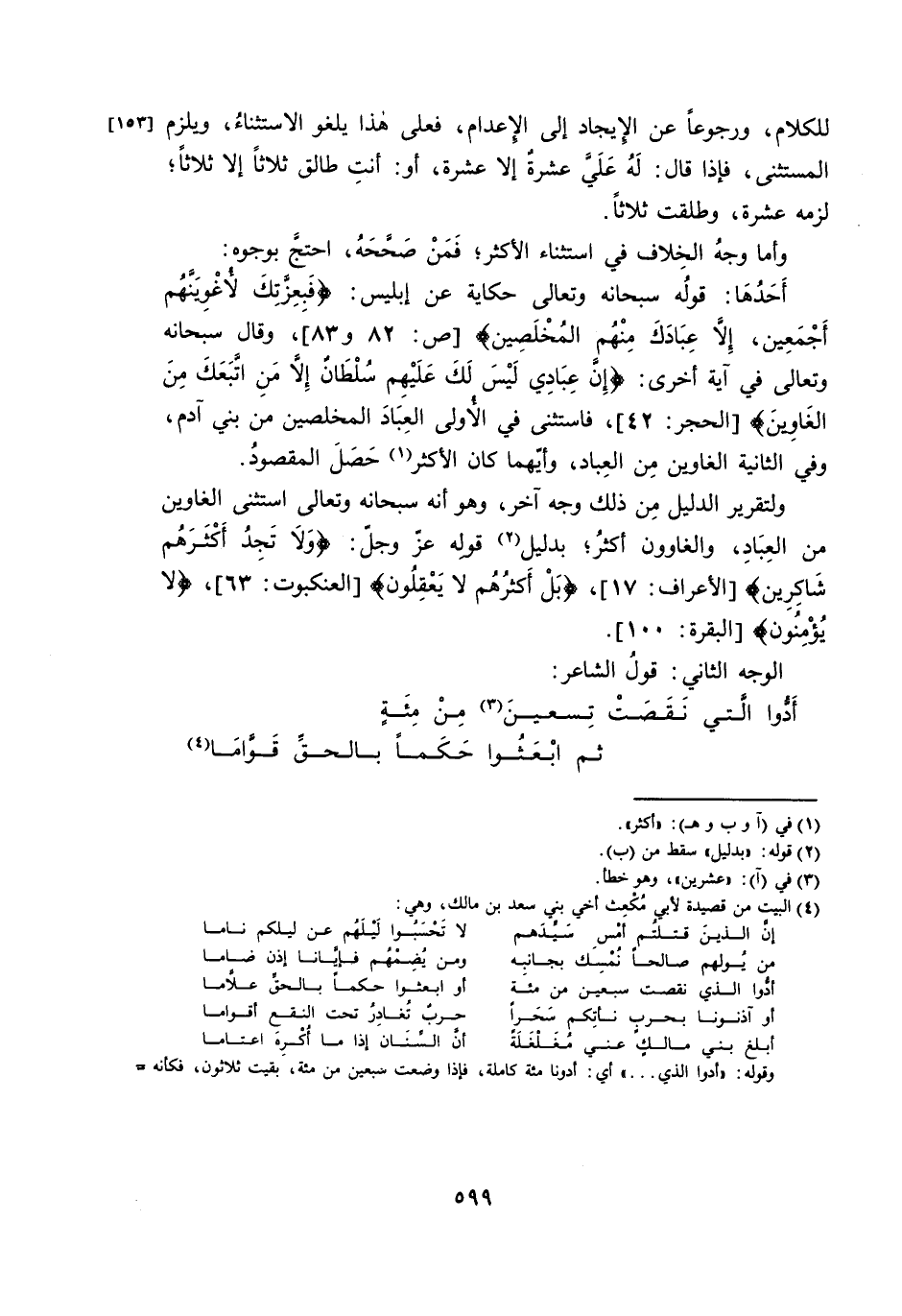 أَحَدُهَا: قَوْلُهُ سُبْحَانَهُ وَتَعَالَى حِكَايَةً عَنْ إِبْلِيسَ: {فَبِعِزَّتِكَ لَأُغْوِيَنَّهُمْ أَجْمَعِينَ} {إِلَّا عِبَادَكَ مِنْهُمُ الْمُخْلَصِينَ} [ص: 82 وَ 83] ، وَقَالَ سُبْحَانَهُ وَتَعَالَى فِي آيَةٍ أُخْرَى: {إِنَّ عِبَادِي لَيْسَ لَكَ عَلَيْهِمْ سُلْطَانٌ إِلَّا مَنِ اتَّبَعَكَ مِنَ الْغَاوِينَ} [الْحِجْرِ: 42] ; فَاسْتَثْنَى فِي الْأُولَى الْعِبَادَ الْمُخْلَصِينَ مِنْ بَنِي آدَمَ، وَفِي الثَّانِيَةِ الْغَاوِينَ مِنَ الْعِبَادِ، وَأَيُّهُمَا كَانَ الْأَكْثَرَ حَصَلَ الْمَقْصُودُ.