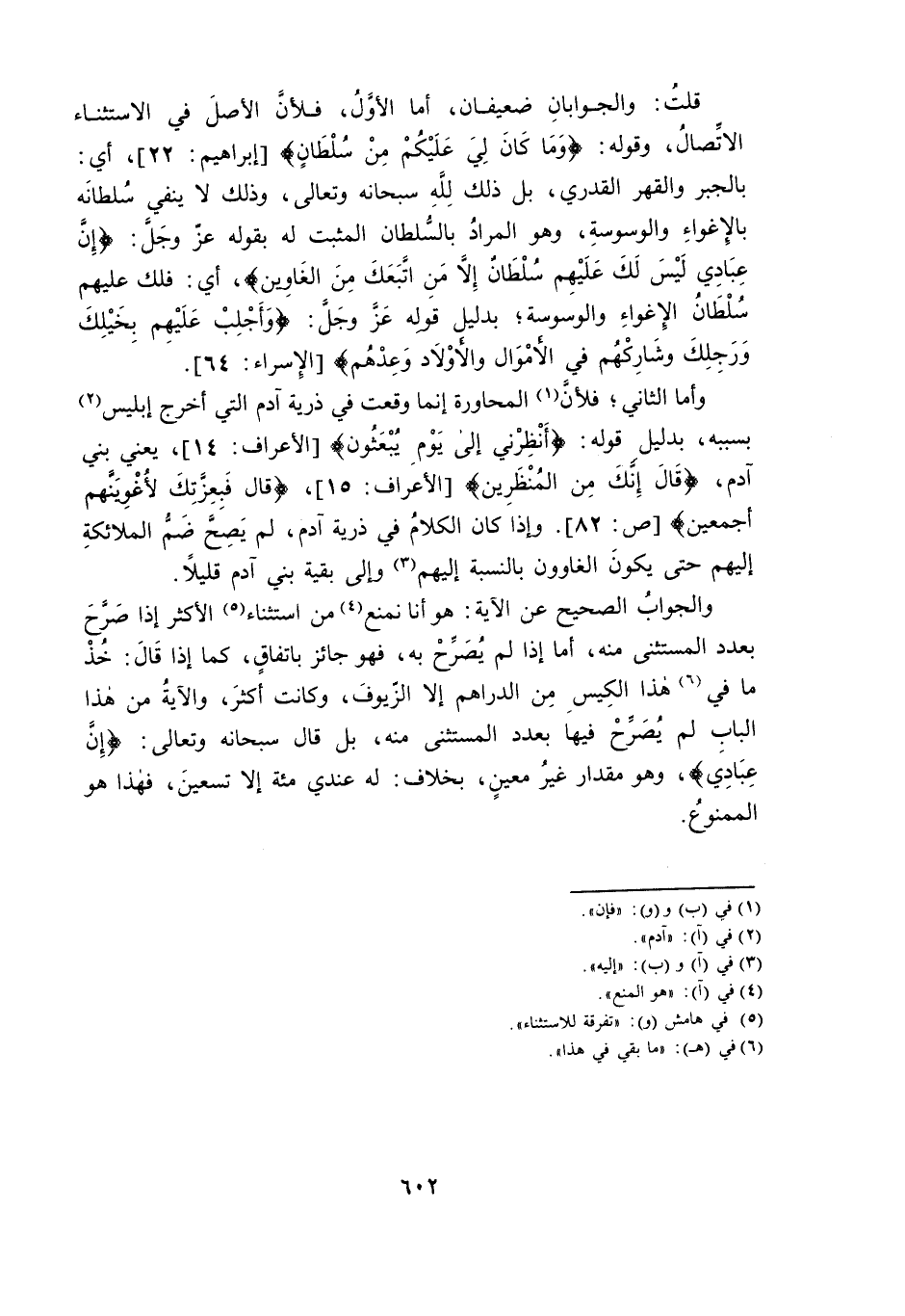 قُلْتُ: وَالْجَوَابَانِ ضَعِيفَانِ، أَمَّا الْأَوَّلُ ; فَلِأَنَّ الْأَصْلَ فِي الِاسْتِثْنَاءِ الِاتِّصَالُ، وَقَوْلُهُ: {وَمَا كَانَ لِي عَلَيْكُمْ مِنْ سُلْطَانٍ} [إِبْرَاهِيمَ: 22] ، أَيْ: بِالْجَبْرِ وَالْقَهْرِ الْقَدَرِيِّ، بَلْ ذَلِكَ لِلَّهِ سُبْحَانَهُ وَتَعَالَى، وَذَلِكَ لَا يَنْفِي سُلْطَانَهُ بِالْإِغْوَاءِ وَالْوَسْوَسَةِ، وَهُوَ الْمُرَادُ بِالسُّلْطَانِ الْمُثْبَتِ لَهُ بِقَوْلِهِ عَزَّ وَجَلَّ: {إِنَّ عِبَادِي لَيْسَ لَكَ عَلَيْهِمْ سُلْطَانٌ إِلَّا مَنِ اتَّبَعَكَ مِنَ الْغَاوِينَ} أَيْ: فَلَكَ عَلَيْهِمْ سُلْطَانُ الْإِغْوَاءِ وَالْوَسْوَسَةِ ; بِدَلِيلِ قَوْلِهِ عَزَّ وَجَلَّ: {وَأَجْلِبْ عَلَيْهِمْ بِخَيْلِكَ وَرَجِلِكَ وَشَارِكْهُمْ فِي الْأَمْوَالِ وَالْأَولَادِ وَعِدْهُمْ} [الْإِسْرَاءِ: 64] .