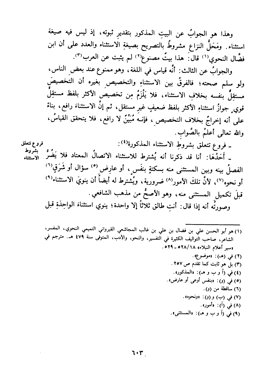 - فُرُوعٌ تَتَعَلَّقُ بِشُرُوطِ الِاسْتِثْنَاءِ الْمَذْكُورَةِ: