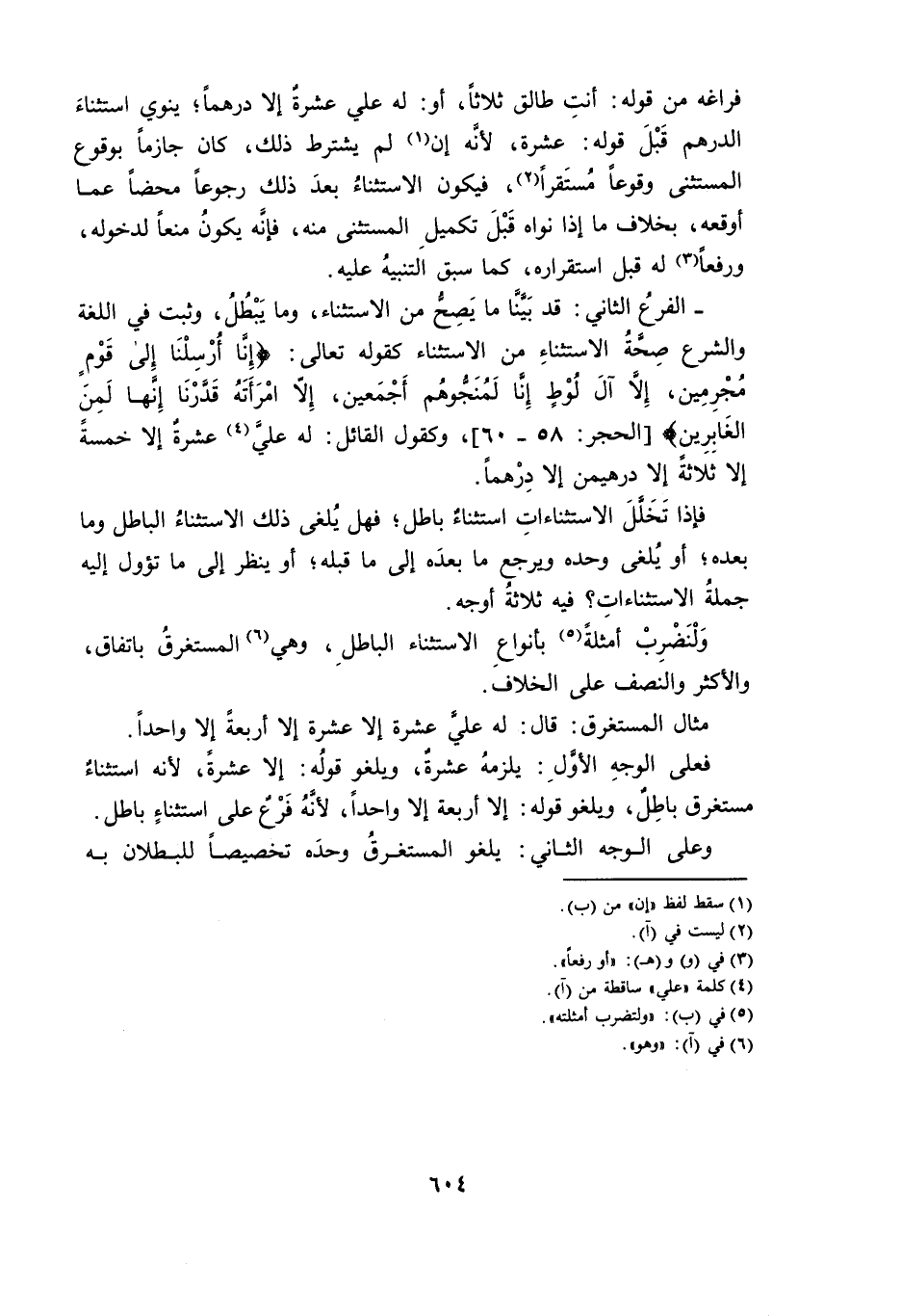 فَرَاغِهِ مِنْ قَوْلِهِ: أَنْتِ طَالِقٌ ثَلَاثًا، أَوْ: لَهُ عَلَيَّ عَشَرَةٌ إِلَّا دِرْهَمًا ; يَنْوِي اسْتِثْنَاءَ الدِّرْهَمَ قَبْلَ قَوْلِهِ: عَشَرَةٌ، لِأَنَّهُ إِنْ لَمْ يَشْتَرِطْ ذَلِكَ، كَانَ جَازِمًا بِوُقُوعِ الْمُسْتَثْنَى وُقُوعًا مُسْتَقِرًّا ; فَيَكُونُ الِاسْتِثْنَاءُ بَعْدَ ذَلِكَ رُجُوعًا مَحْضًا عَمَّا أَوْقَعَهُ، بِخِلَافِ مَا إِذَا نَوَاهُ قَبْلَ تَكْمِيلِ الْمُسْتَثْنَى مِنْهُ ; فَإِنَّهُ يَكُونُ مَنْعًا لِدُخُولِهِ، وَرَفْعًا لَهُ قَبْلَ اسْتِقْرَارِهِ، كَمَا سَبَقَ التَّنْبِيهُ عَلَيْهِ.