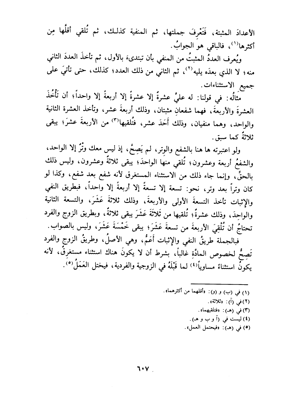 فَبِالْجُمْلَةِ طَرِيقُ النَّفْيِ وَالْإِثْبَاتِ أَعَمُّ، وَهِيَ الْأَصْلُ، وَطَرِيقُ الزَّوْجِ وَالْفَرْدِ تَصِحُّ لِخُصُوصِ الْمَادَّةِ غَالِبًا، بِشَرْطِ أَنْ لَا يَكُونَ هُنَاكَ اسْتِثْنَاءٌ مُسْتَغْرِقٌ ; لِأَنَّهُ يَكُونُ اسْتِثْنَاءً مُسَاوِيًا لِمَا قَبْلَهُ فِي الزَّوْجِيَّةِ وَالْفَرْدِيَّةِ ; فَيَخْتَلُّ الْعَمَلُ.