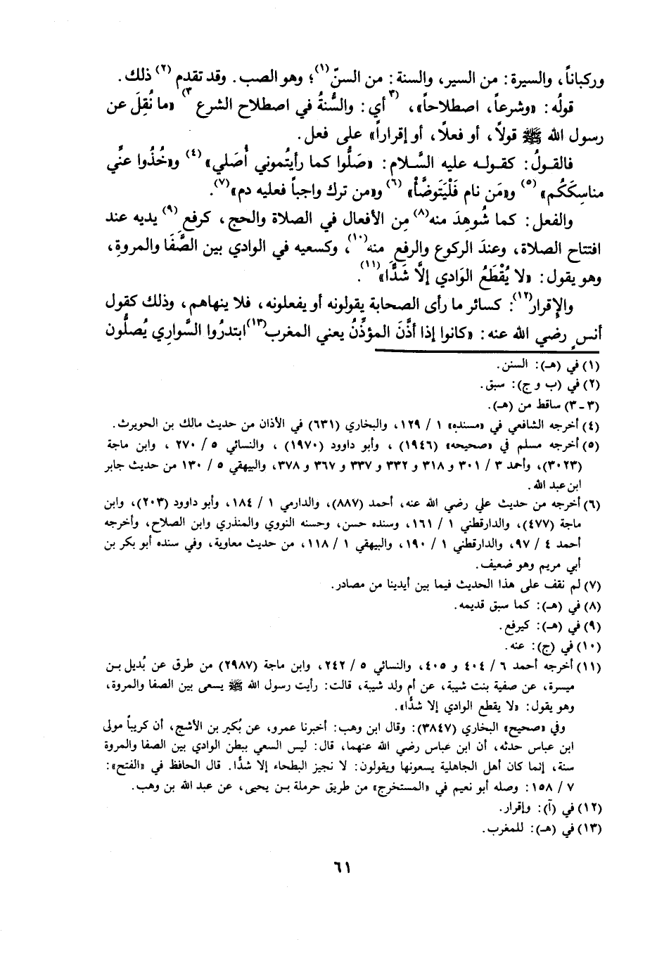 وَالْفِعْلُ: كَمَا شُوهِدَ مِنْهُ مِنَ الْأَفْعَالِ فِي الصَّلَاةِ وَالْحَجِّ، كَرَفْعِ يَدَيْهِ عِنْدَ افْتِتَاحِ الصَّلَاةِ، وَعِنْدَ الرُّكُوعِ وَالرَّفْعِ مِنْهُ، وَكَسَعْيِهِ فِي الْوَادِي بَيْنَ الصَّفَا وَالْمَرْوَةِ، وَهُوَ يَقُولُ: لَا يُقْطَعُ الْوَادِي إِلَّا شَدًّا.
