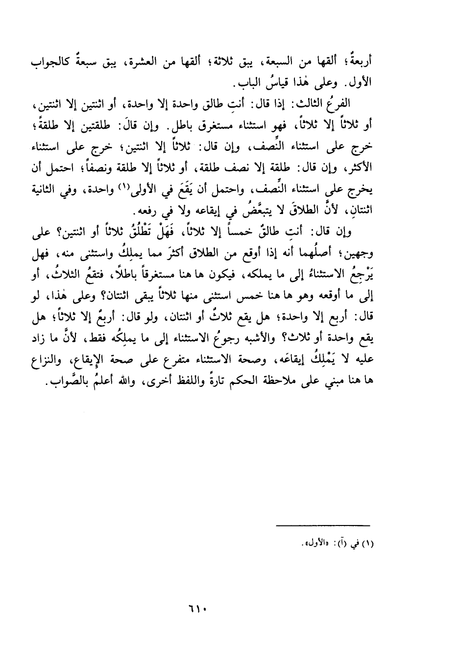 وَإِنْ قَالَ: أَنْتِ طَالِقٌ خَمْسًا إِلَّا ثَلَاثَةً ; فَهَلْ تُطَلَّقُ ثَلَاثًا أَوِ اثْنَتَيْنِ؟ عَلَى وَجْهَيْنِ، أَصْلُهُمَا أَنَّهُ إِذَا أَوْقَعَ مِنَ الطَّلَاقِ أَكْثَرَ مِمَّا يَمْلِكُ وَاسْتَثْنَى مِنْهُ ; فَهَلْ يَرْجِعُ الِاسْتِثْنَاءُ إِلَى مَا يَمْلِكُهُ ; فَيَكُونُ هَاهُنَا مُسْتَغْرِقًا بَاطِلًا ; فَتَقَعُ الثَّلَاثُ، أَوْ إِلَى مَا أَوْقَعَهُ وَهُوَ هَاهُنَا خَمْسٌ اسْتَثْنَى مِنْهَا ثَلَاثًا يَبْقَى اثْنَتَانِ؟ وَعَلَى هَذَا، لَوْ قَالَ: أَرْبَعٌ إِلَّا وَاحِدَةً، هَلْ يَقَعُ ثَلَاثٌ أَوِ اثْنَتَانِ، وَلَوْ قَالَ: أَرْبَعٌ إِلَّا ثَلَاثًا، هَلْ يَقَعُ وَاحِدَةٌ أَوْ ثَلَاثٌ؟ وَالْأَشْبَهُ رُجُوعُ الِاسْتِثْنَاءِ إِلَى مَا يَمْلِكُهُ فَقَطْ ; لِأَنَّ مَا زَادَ عَلَيْهِ لَا يَمْلِكُ إِيقَاعَهُ، وَصِحَّةُ الِاسْتِثْنَاءِ مُتَفَرِّعٌ عَلَى صِحَّةِ الْإِيقَاعِ، وَالنِّزَاعُ هَاهُنَا مَبْنِيٌّ عَلَى مُلَاحَظَةِ الْحُكْمِ تَارَةً وَاللَّفْظِ أُخْرَى، وَاللَّهُ أَعْلَمُ بِالصَّوَابِ.