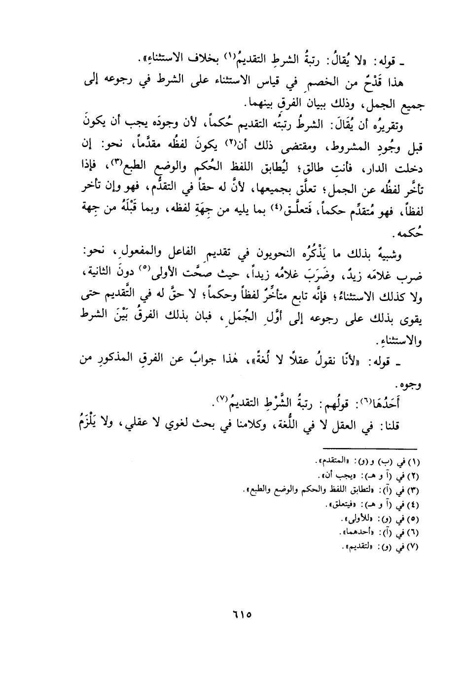 - قَوْلُهُ: «لَا يُقَالُ: رُتْبَةُ الشَّرْطِ التَّقْدِيمُ بِخِلَافِ الِاسْتِثْنَاءِ» .