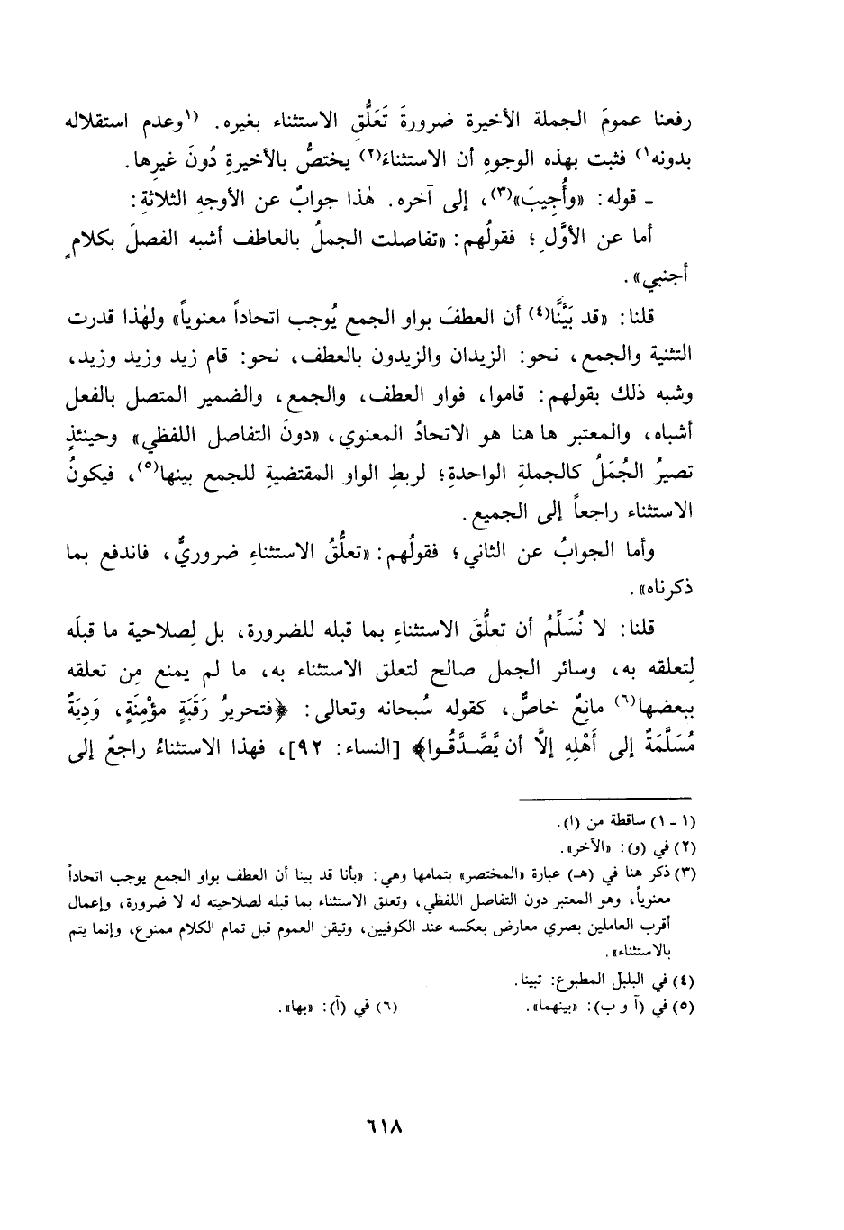 رَفَعْنَا عُمُومَ الْجُمْلَةِ الْأَخِيرَةِ ضَرُورَةَ تَعَلُّقِ الِاسْتِثْنَاءِ بِغَيْرِهِ، وَعَدَمَ اسْتِقْلَالِهِ بِدُونِهِ فَثَبَتَ بِهَذِهِ الْوُجُوهِ أَنَّ الِاسْتِثْنَاءَ يَخْتَصُّ بِالْأَخِيرَةِ دُونَ غَيْرِهَا.