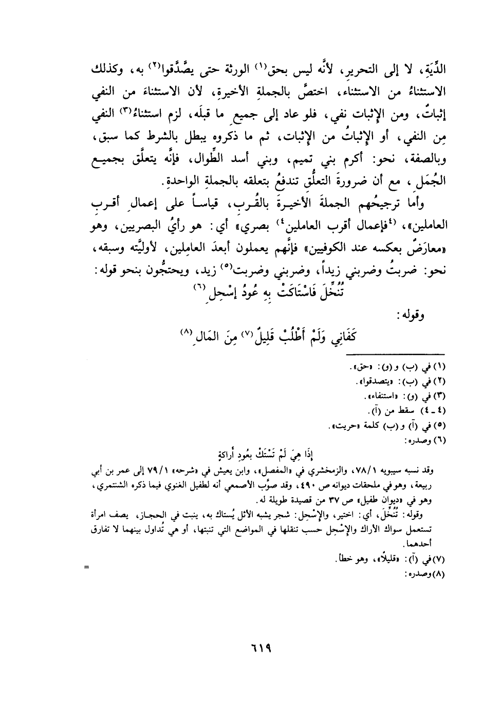 الدِّيَةِ، لَا إِلَى التَّحْرِيرِ ; لِأَنَّهُ لَيْسَ بِحَقِّ الْوَرَثَةِ حَتَّى يَصَّدَّقُوا بِهِ، وَكَذَلِكَ الِاسْتِثْنَاءُ مِنْ الِاسْتِثْنَاءِ، اخْتَصَّ بِالْجُمْلَةِ الْأَخِيرَةِ ; لِأَنَّ الِاسْتِثْنَاءَ مِنَ النَّفْيِ إِثْبَاتٌ، وَمِنَ الْإِثْبَاتِ نَفْيٌ ; فَلَوْ عَادَ إِلَى جَمِيعِ مَا قَبْلَهُ، لَزِمَ اسْتِثْنَاءُ النَّفْيِ مِنَ النَّفْيِ، أَوِ الْإِثْبَاتِ مِنَ الْإِثْبَاتِ، ثُمَّ مَا ذَكَرُوهُ يَبْطُلُ بِالشَّرْطِ كَمَا سَبَقَ، وَبِالصِّفَةِ، نَحْوُ: أَكْرِمْ بَنِي تَمِيمٍ، وَبَنِي أَسَدٍ الطِّوَالَ ; فَإِنَّهُ يَتَعَلَّقُ بِجَمِيعِ الْجُمَلِ، مَعَ أَنَّ ضَرُورَةَ التَّعَلُّقِ تَنْدَفِعُ بِتَعَلُّقِهِ بِالْجُمْلَةِ الْوَاحِدَةِ.