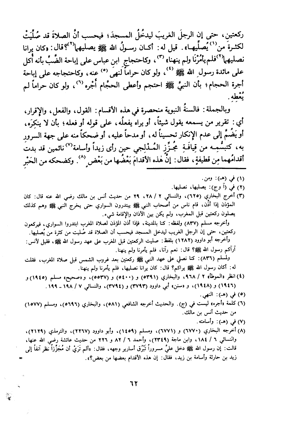 رَكْعَتَيْنِ، حَتَّى إِنِ الرَّجُلَ الْغَرِيبَ لَيَدْخُلُ الْمَسْجِدَ ; فَيَحْسَبُ أَنَّ الصَّلَاةَ قَدْ صُلِّيَتْ لِكَثْرَةِ مَنْ يُصَلِّيهَا، قِيلَ لَهُ: أَكَانَ رَسُولُ اللَّهِ - صَلَّى اللَّهُ عَلَيْهِ وَسَلَّمَ - يُصَلِّيهِمَا؟ قَالَ: كَانَ يَرَانَا نُصَلِّيهِمَا فَلَمْ يَأْمُرْنَا وَلَمْ يَنْهَنَا، وَكَاحْتِجَاجِ ابْنِ عَبَّاسٍ عَلَى إِبَاحَةِ الضَّبِّ بِأَنَّهُ أُكِلَ عَلَى مَائِدَةِ رَسُولِ اللَّهِ - صَلَّى اللَّهُ عَلَيْهِ وَسَلَّمَ - وَلَوْ كَانَ حَرَامًا لَنَهَى عَنْهُ، وَكَاحْتِجَاجِهِ عَلَى إِبَاحَةِ أُجْرَةِ الْحَجَّامِ، بِأَنَّ النَّبِيَّ - صَلَّى اللَّهُ عَلَيْهِ وَسَلَّمَ - احْتَجَمَ وَأَعْطَى الْحَجَّامَ أَجْرَهُ، وَلَوْ كَانَ حَرَامًا لَمْ يُعْطِهِ.