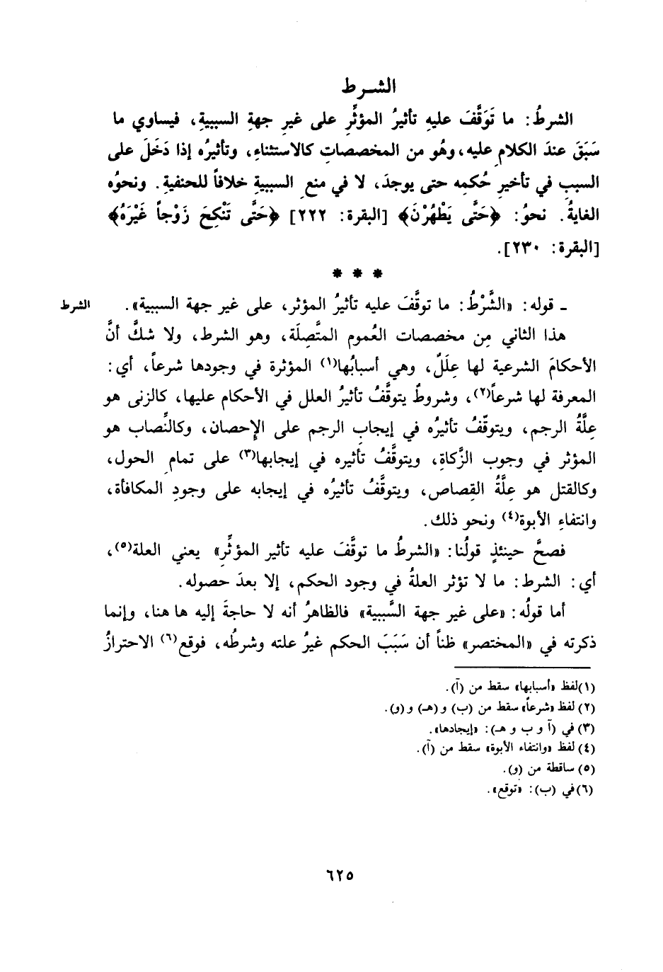 فَصَحَّ حِينَئِذٍ قَوْلُنَا: «الشَّرْطُ مَا تَوَقَّفَ عَلَيْهِ تَأْثِيرُ الْمُؤَثِّرِ» ، يَعْنِي الْعِلَّةَ، أَيِ: الشَّرْطُ: مَا لَا تُؤَثِّرُ الْعِلَّةُ فِي وُجُودِ الْحُكْمِ، إِلَّا بَعْدَ حُصُولِهِ.