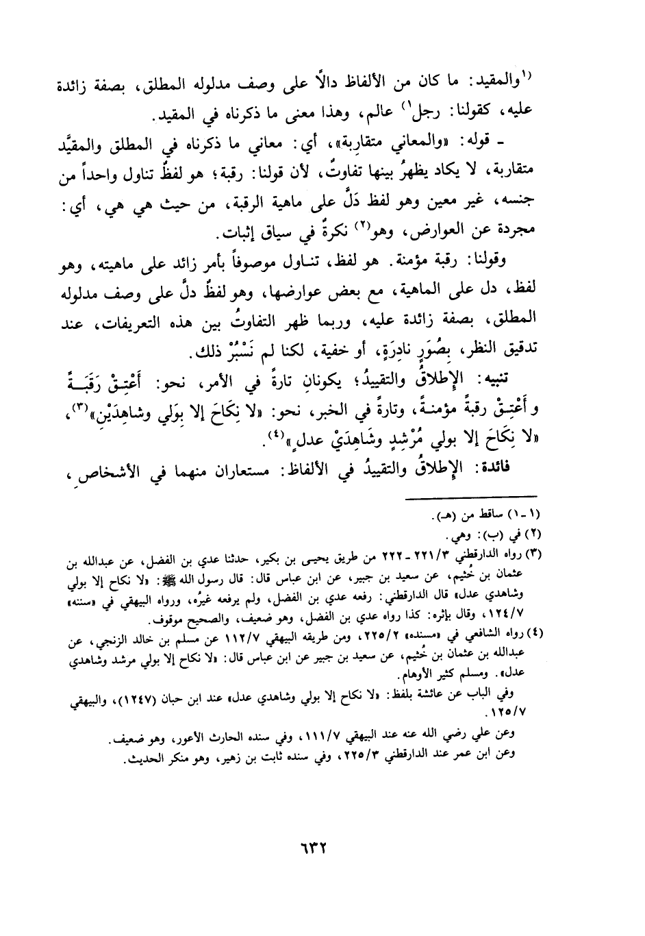 وَقَوْلُنَا: رَقَبَةٌ مُؤْمِنَةٌ. هُوَ لَفْظٌ، تَنَاوَلَ مَوْصُوفًا بِأَمْرٍ زَائِدٍ عَلَى مَاهِيَّتِهِ، وَهُوَ لَفْظٌ، دَلَّ عَلَى الْمَاهِيَّةِ، مَعَ بَعْضِ عَوَارِضِهَا، وَهُوَ لَفْظٌ دَلَّ عَلَى وَصْفِ مَدْلُولِهِ الْمُطْلَقِ، بِصِفَةٍ زَائِدَةٍ عَلَيْهِ، وَرُبَّمَا ظَهَرَ التَّفَاوُتُ بَيْنَ هَذِهِ التَّعْرِيفَاتِ، عِنْدَ تَدْقِيقِ النَّظَرِ، بِصُورَةٍ نَادِرَةٍ، أَوْ خَفِيَّةٍ، لَكِنَّا لَمْ نَسْبُرْ ذَلِكَ.