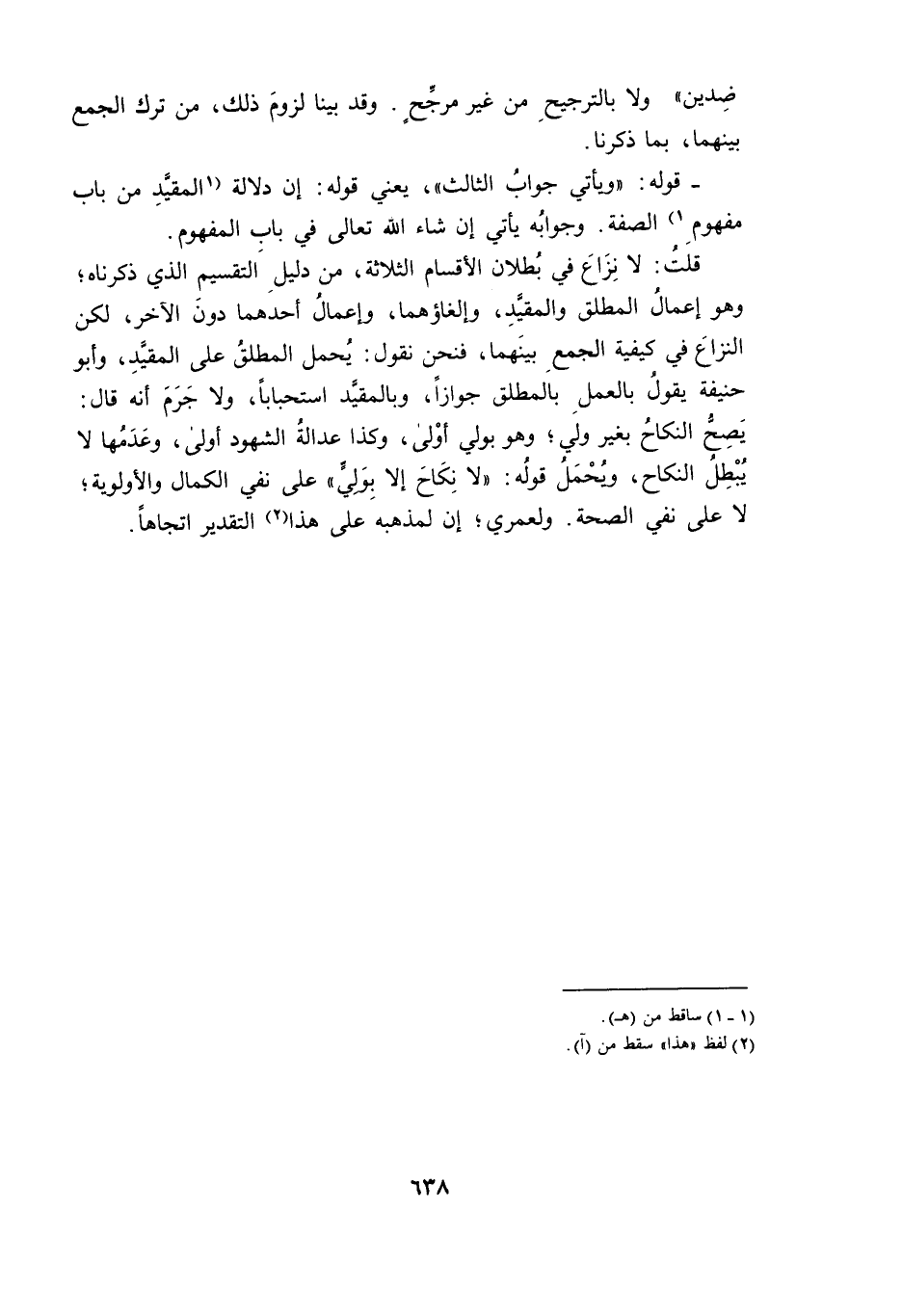 قُلْتُ: لَا نِزَاعَ فِي بُطْلَانِ الْأَقْسَامِ الثَّلَاثَةِ، مِنْ دَلِيلِ التَّقْسِيمِ الَّذِي ذَكَرْنَاهُ، وَهُوَ إِعْمَالُ الْمُطْلَقِ وَالْمُقَيَّدِ، وَإِلْغَاؤُهُمَا، وَإِعْمَالُ أَحَدِهِمَا دُونَ الْآخَرِ، لَكِنَّ النِّزَاعَ فِي كَيْفِيَّةِ الْجَمْعِ بَيْنَهُمَا ; فَنَحْنُ نَقُولُ: يُحْمَلُ الْمُطْلَقُ عَلَى الْمُقَيَّدِ، وَأَبُو حَنِيفَةُ يَقُولُ بِالْعَمَلِ بِالْمُطْلَقِ جَوَازًا، وَبِالْمُقَيَّدِ اسْتِحْبَابًا، وَلَا جَرَمَ أَنَّهُ قَالَ: يَصِحُّ النِّكَاحُ بِغَيْرِ وَلِيٍّ، وَهُوَ بَوَلِيٍّ أَوْلَى، وَكَذَا عَدَالَةُ الشُّهُودِ أَوْلَى، وَعَدَمُهَا لَا يُبْطِلُ النِّكَاحَ، وَيُحْمَلُ قَوْلُهُ: «لَا نِكَاحَ إِلَّا بِوَلِيٍّ» ، عَلَى نَفْيِ الْكَمَالِ وَالْأَوْلَوِيَّةِ، لَا عَلَى نَفْيِ الصِّحَّةِ. وَلَعَمْرِي، إِنَّ لِمَذْهَبِهِ عَلَى هَذَا التَّقْدِيرِ اتِّجَاهًا.