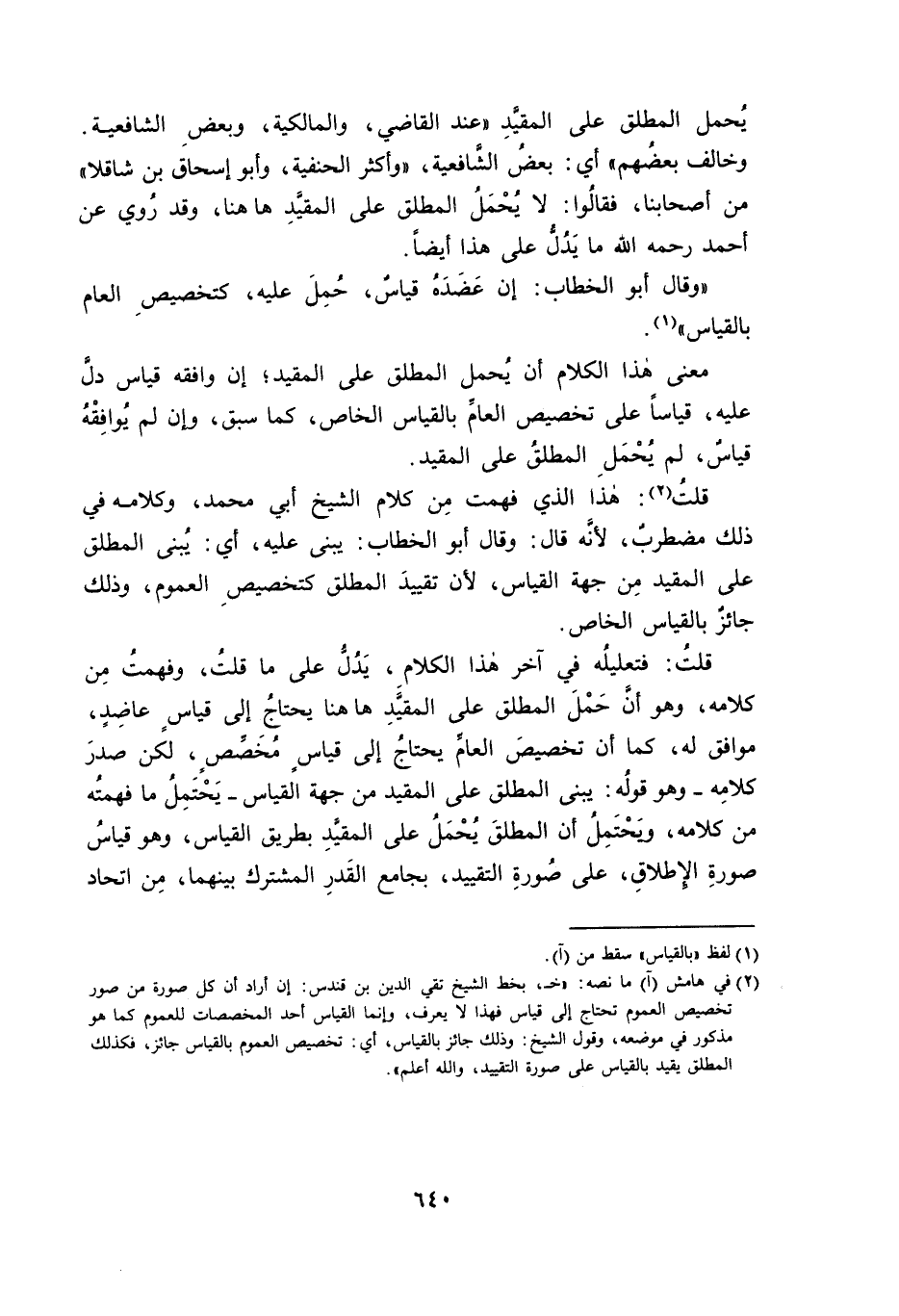 قُلْتُ: فَتَعْلِيلُهُ فِي آخِرِ هَذَا الْكَلَامِ، يَدُلُّ عَلَى مَا قُلْتُ، وَفَهِمْتُ مِنْ كَلَامِهِ، وَهُوَ أَنَّ حَمْلَ الْمُطْلَقِ عَلَى الْمُقَيَّدِ هَاهُنَا يَحْتَاجُ إِلَى قِيَاسٍ عَاضِدٍ، مُوَافِقٍ لَهُ، كَمَا أَنَّ تَخْصِيصَ الْعَامِّ يَحْتَاجُ إِلَى قِيَاسٍ مُخَصِّصٍ، لَكِنَّ صَدْرَ كَلَامِهِ وَهُوَ قَوْلُهُ: يُبْنَى الْمُطْلَقُ عَلَى الْمُقَيَّدِ مِنْ جِهَةِ الْقِيَاسِ، يَحْتَمِلُ مَا فَهِمْتُهُ مِنْ كَلَامِهِ، وَيَحْتَمِلُ أَنَّ الْمُطْلَقَ يُحْمَلُ عَلَى الْمُقَيَّدِ بِطَرِيقِ الْقِيَاسِ، وَهُوَ قِيَاسُ صُورَةِ الْإِطْلَاقِ، عَلَى صُورَةِ التَّقْيِيدِ، بِجَامِعِ الْقَدْرِ الْمُشْتَرَكِ بَيْنَهُمَا، مِنَ اتِّحَادِ