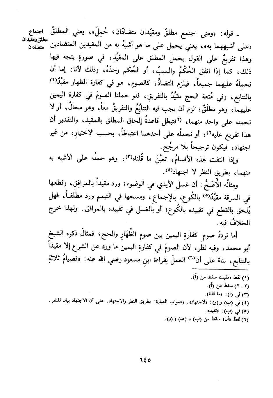 قَوْلُهُ: «وَمَتَى اجْتَمَعَ مُطْلَقٌ وَمُقَيَّدَانِ مُتَضَادَّانِ، حُمِلَ» ، يَعْنِي الْمُطْلَقَ «عَلَى أَشْبَهِهِمَا بِهِ» ، يَعْنِي يُحْمَلُ عَلَى مَا هُوَ أَشْبَهُ بِهِ مِنَ الْمُقَيَّدَيْنِ الْمُتَضَادَّيْنِ، وَهَذَا تَفْرِيعٌ عَلَى الْقَوْلِ بِحَمْلِ الْمُطْلَقِ عَلَى الْمُقَيَّدِ، فِي صُورَةٍ يَتَّجِهُ فِيهَا ذَلِكَ، كَمَا إِذَا اتَّفَقَ الْحُكْمُ وَالسَّبَبُ، أَوِ الْحُكْمُ وَحْدَهُ، وَذَلِكَ لِأَنَّا: إِمَّا أَنْ نَحْمِلَهُ عَلَيْهِمَا جَمِيعًا ; فَيَلْزَمُ التَّضَادُّ، كَالصَّوْمِ، هُوَ فِي كَفَّارَةِ الظِّهَارِ مُقَيَّدٌ بِالتَّتَابُعِ، وَفِي مُتْعَةِ الْحَجِّ مُقَيَّدٌ بِالتَّفْرِيقِ ; فَلَوْ حَمَلْنَا الصَّوْمَ فِي كَفَّارَةِ الْيَمِينِ عَلَيْهِمَا، وَهُوَ مُطْلَقٌ، لَزِمَ أَنْ يَجِبَ فِيهِ التَّتَابُعُ وَالتَّفْرِيقُ مَعًا، وَهُوَ مُحَالٌ، أَوْ لَا نَحْمِلُهُ عَلَى وَاحِدٍ مِنْهُمَا ; فَتَبْطُلُ قَاعِدَةُ إِلْحَاقِ الْمُطْلَقِ بِالْمُقَيَّدِ، وَالتَّقْدِيرُ أَنَّ هَذَا تَفْرِيعٌ عَلَيْهِ، أَوْ نَحْمِلُهُ عَلَى أَحَدِهِمَا اعْتِبَاطًا، بِحَسَبِ الِاخْتِيَارِ، مِنْ غَيْرِ اجْتِهَادٍ ; فَيَكُونُ تَرْجِيحًا بِلَا مُرَجِّحٍ.