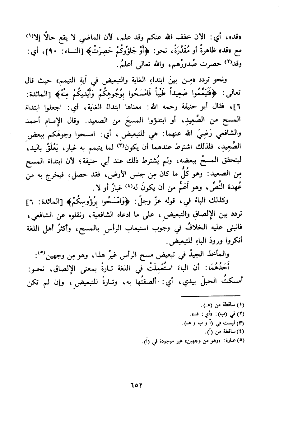 أَحَدُهُمَا: أَنَّ الْبَاءَ اسْتُعْمِلَتْ فِي اللُّغَةِ تَارَةً بِمَعْنَى الْإِلْصَاقِ، نَحْوَ: أَمْسَكْتُ الْحَبَلَ بِيَدِي، أَيْ: أَلْصَقْتُهَا بِهِ، وَتَارَةً لِلتَّبْعِيضِ، وَإِنْ لَمْ تَكُنْ