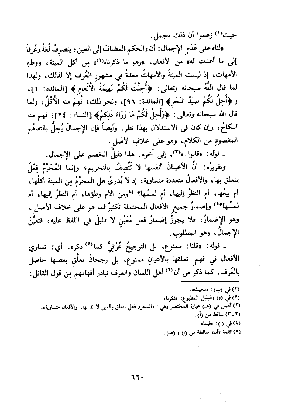 «لَنَا» عَلَى عَدَمِ الْإِجْمَالِ: أَنَّ «الْحُكْمَ الْمُضَافَ إِلَى الْعَيْنِ، يَنْصَرِفُ لُغَةً وَعُرْفًا إِلَى مَا أُعِدَّتْ لَهُ» مِنَ الْأَفْعَالِ، وَهُوَ مَا ذَكَرْنَاهُ مِنْ أَكْلِ الْمَيْتَةِ، وَوَطْءِ الْأُمَّهَاتِ، إِذْ لَيْسَتِ الْمَيْتَةُ وَالْأُمَّهَاتُ مُعَدَّةً فِي مَشْهُورِ الْعُرْفِ إِلَّا لِذَلِكَ، وَلِهَذَا لَمَّا قَالَ اللَّهُ سُبْحَانَهُ وَتَعَالَى: {أُحِلَّتْ لَكُمْ بَهِيمَةُ الْأَنْعَامِ} [الْمَائِدَةِ: 1] ، {أُحِلَّ لَكُمْ صَيْدُ الْبَحْرِ} [الْمَائِدَةِ: 96] ، وَنَحْوَ ذَلِكَ ; فُهِمَ مِنْهُ الْأَكْلُ، وَلَمَّا قَالَ اللَّهُ سُبْحَانَهُ وَتَعَالَى: {وَأُحِلَّ لَكُمْ مَا وَرَاءَ ذَلِكُمْ} [النِّسَاءِ: 24] ; فُهِمَ مِنْهُ النِّكَاحُ، وَإِنْ كَانَ فِي الِاسْتِدْلَالِ بِهَذَا نَظَرٌ، وَأَيْضًا فَإِنَّ الْإِجْمَالَ يُخِلُّ بِالتَّفَاهُمِ الْمَقْصُودِ مِنَ الْكَلَامِ، وَهُوَ عَلَى خِلَافِ الْأَصْلِ.