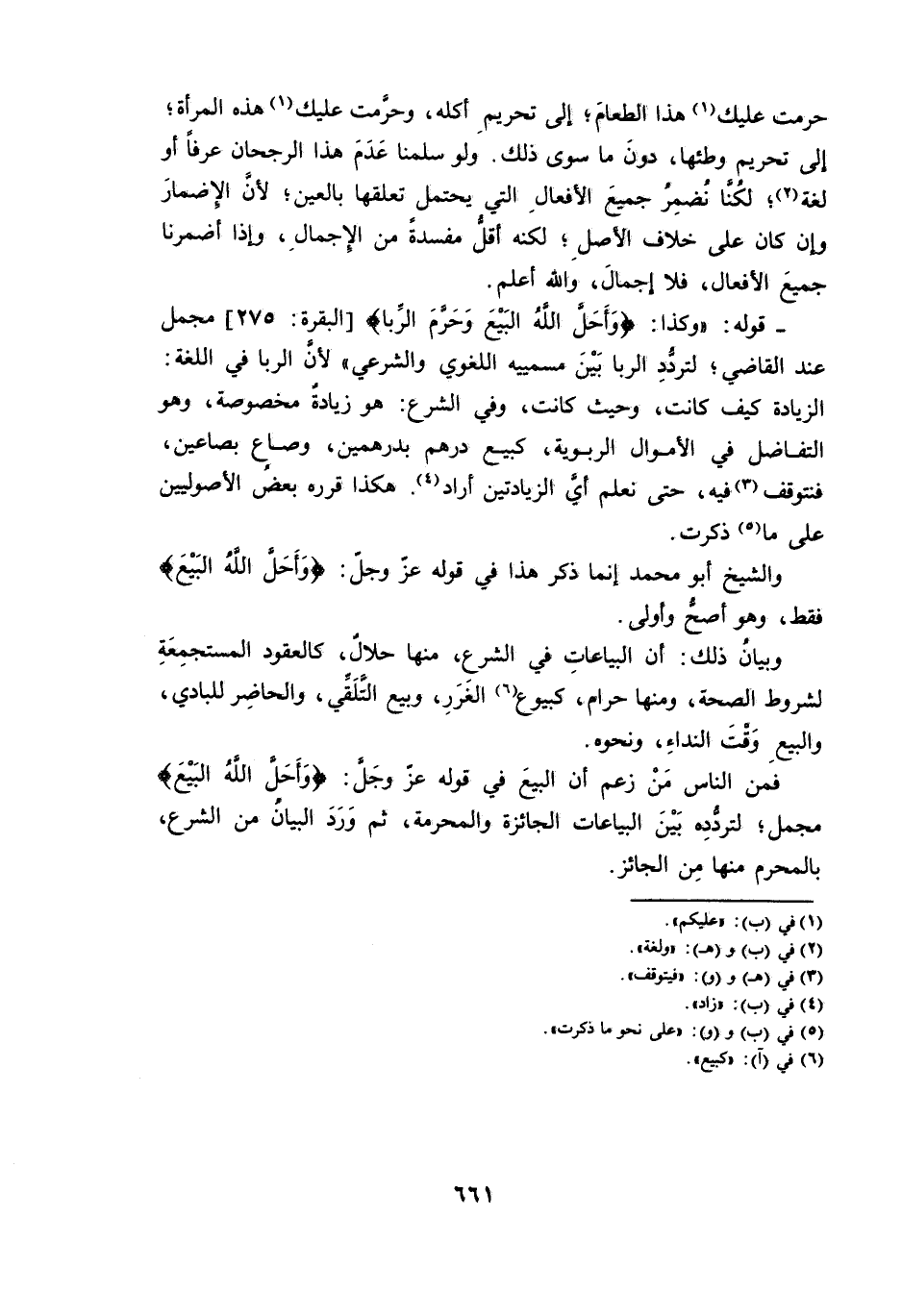 - قَوْلُهُ: «وَكَذَا» : {وَأَحَلَّ اللَّهُ الْبَيْعَ وَحَرَّمَ الرِّبَا} [الْبَقَرَةِ: 275] ، مُجْمَلٌ عِنْدِ الْقَاضِي ; لِتَرَدُّدِ الرِّبَا بَيْنَ مُسَمَّيَيْهِ اللُّغَوِيِّ وَالشَّرْعِيِّ لِأَنَّ الرِّبَا فِي اللُّغَةِ: الزِّيَادَةُ كَيْفَ كَانَتْ، وَحَيْثُ كَانَتْ، وَفِي الشَّرْعِ: هُوَ زِيَادَةٌ مَخْصُوصَةٌ، وَهُوَ التَّفَاضُلُ فِي الْأَمْوَالِ الرِّبَوِيَّةِ، كَبَيْعِ دِرْهَمٍ بِدِرْهَمَيْنِ، وَصَاعٍ بِصَاعَيْنِ ; فَنَتَوَقَّفُ فِيهِ، حَتَّى نَعْلَمَ أَيَّ الزِّيَادَتَيْنِ أَرَادَ. هَكَذَا قَرَّرَهُ بَعْضُ الْأُصُولِيِّينَ عَلَى مَا ذَكَرْتُ.