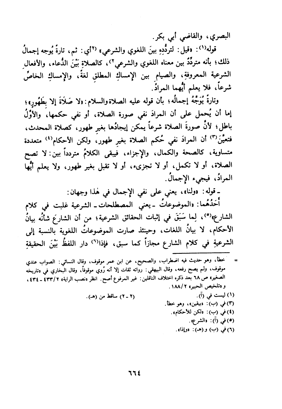 وَتَارَةً يُوَجَّهُ إِجْمَالُهُ، بِأَنَّ قَوْلَهُ عَلَيْهِ الصَّلَاةُ وَالسَّلَامُ: «لَا صَلَاةَ إِلَّا بِطَهُورٍ» ; إِمَّا أَنْ يُحْمَلَ عَلَى أَنَّ الْمُرَادَ نَفْيُ صُورَةِ الصَّلَاةِ، أَوْ نَفْيُ حُكْمِهَا، وَالْأَوَّلُ بَاطِلٌ ; لِأَنَّ صُورَةَ الصَّلَاةِ شَرْعًا يُمْكِنُ إِيجَادُهَا بِغَيْرِ طَهُورٍ، كَصَلَاةِ الْمُحْدِثِ ; فَتَعَيَّنَ أَنَّ الْمُرَادَ نَفْيُ حُكْمِ الصَّلَاةِ بِغَيْرِ طَهُورٍ، وَلَكِنَّ الْأَحْكَامَ مُتَعَدِّدَةٌ مُتَسَاوِيَةٌ، كَالصِّحَّةِ وَالْكَمَالِ، وَالْإِجْزَاءِ ; فَيَبْقَى الْكَلَامُ مُتَرَدِّدًا بَيْنَ: لَا تَصِحُّ الصَّلَاةُ، أَوْ لَا تَكْمُلُ، أَوْ لَا تُجْزِئُ، أَوْ لَا تُقْبَلُ بِغَيْرِ طَهُورٍ، وَلَا يُعْلَمُ أَيُّهَا الْمُرَادُ ; فَيَجِيءُ الْإِجْمَالُ.