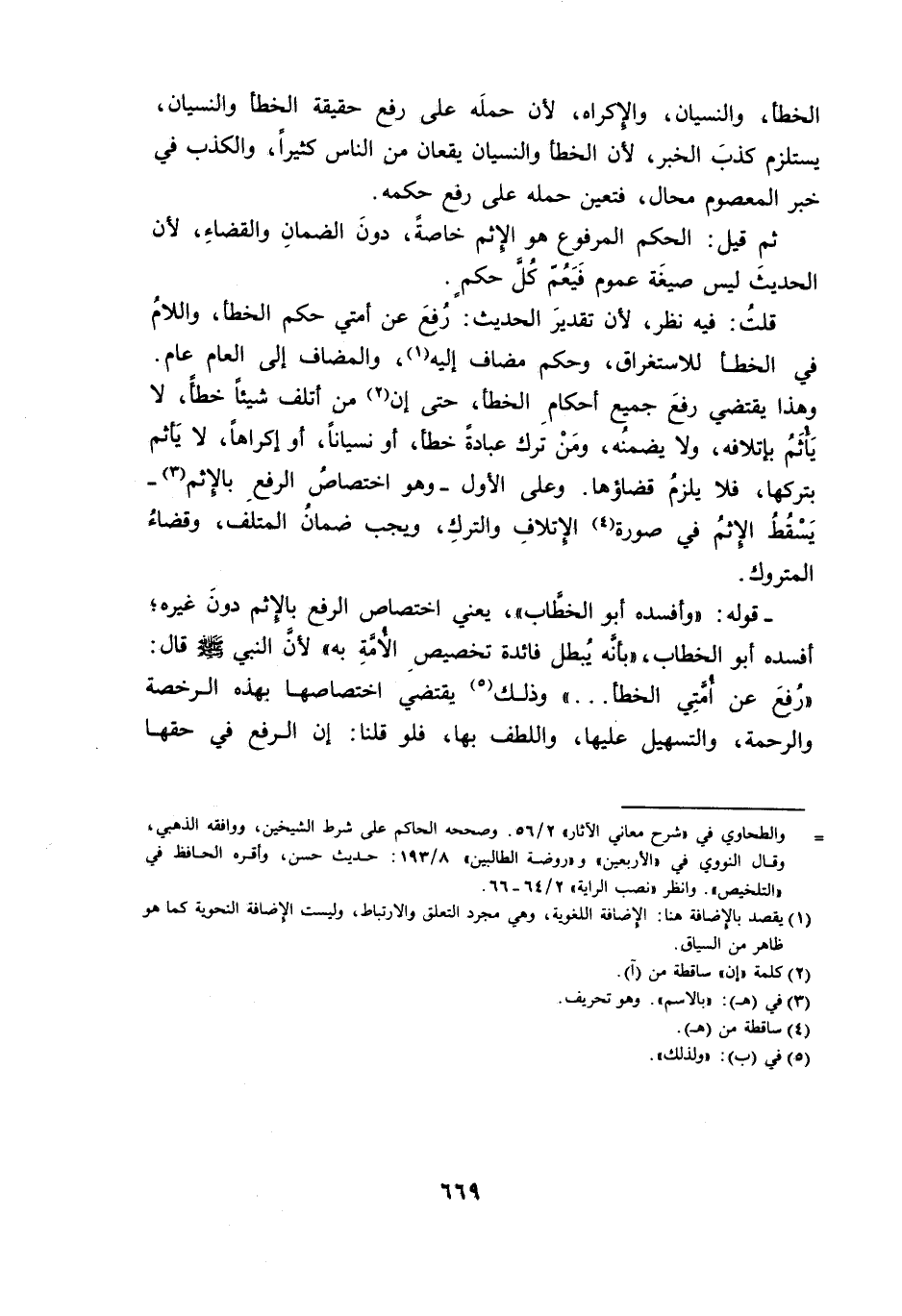 قُلْتُ: فِيهِ نَظَرٌ ; لِأَنَّ تَقْدِيرَ الْحَدِيثِ: رُفِعَ عَنْ أُمَّتِي حُكْمُ الْخَطَأِ، وَاللَّامُ فِي الْخَطَأِ لِلِاسْتِغْرَاقِ، وَحُكْمُ مُضَافٌ إِلَيْهِ، وَالْمُضَافُ إِلَى الْعَامِّ عَامٌّ. وَهَذَا يَقْتَضِي رَفْعَ جَمِيعِ أَحْكَامِ الْخَطَأِ، حَتَّى إِنَّ مَنْ أَتْلَفَ شَيْئًا خَطَأً، لَا يَأْثَمُ بِإِتْلَافِهِ، وَلَا يُضَمَّنُهُ، وَمَنْ تَرَكَ عِبَادَةً خَطَأً، أَوْ نِسْيَانًا، أَوْ إِكْرَاهًا، لَا يَأْثَمُ بِتَرْكِهَا ; فَلَا يَلْزَمُ قَضَاؤُهَا. وَعَلَى الْأَوَّلِ، وَهُوَ اخْتِصَاصُ الرَّفْعِ بِالْإِثْمِ، يَسْقُطُ الْإِثْمُ فِي صُورَةِ الْإِتْلَافِ وَالتَّرْكِ، وَيَجِبُ ضَمَانُ الْمُتْلَفِ، وَقَضَاءُ الْمَتْرُوكِ.
