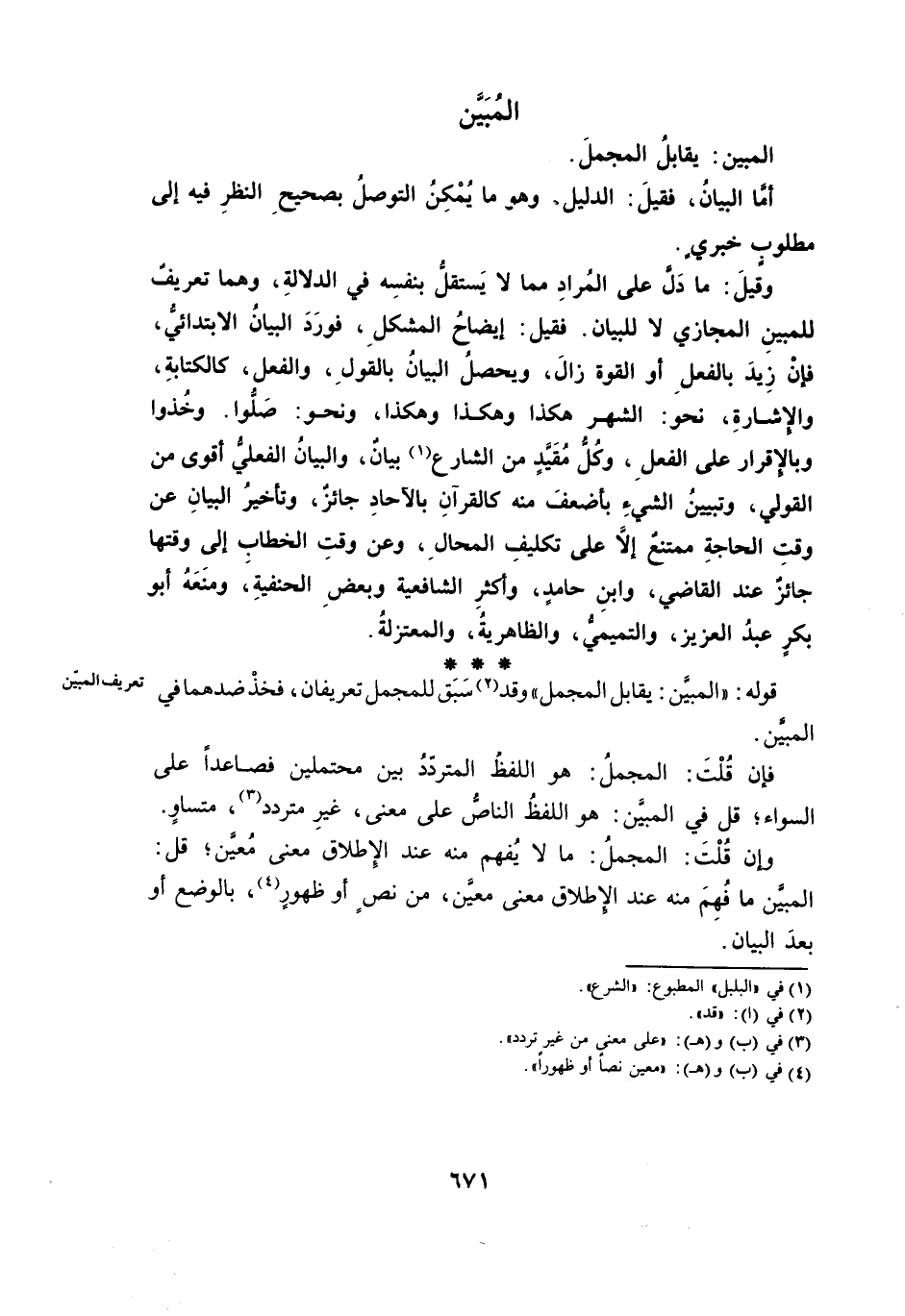 الْمُبَيَّنُ: يُقَابِلُ الْمُجْمَلَ.