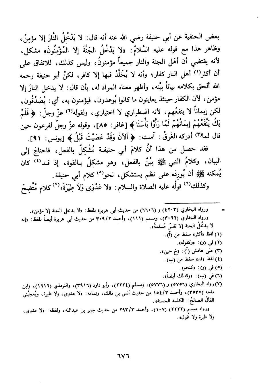 بَعْضُ الْحَنَفِيَّةِ عَنْ أَبِي حَنِيفَةَ رَضِيَ اللَّهُ عَنْهُ أَنَّهُ قَالَ: لَا يَدْخُلُ النَّارَ إِلَّا مُؤْمِنٌ، وَظَاهِرُ هَذَا مَعَ قَوْلِهِ عَلَيْهِ السَّلَامُ: لَا يَدْخُلُ الْجَنَّةَ إِلَّا الْمُؤْمِنُونَ - مُشْكِلٌ ; لِأَنَّهُ يَقْتَضِي أَنَّ أَهْلَ الْجَنَّةِ وَالنَّارِ جَمِيعًا مُؤْمِنُونَ، وَلَيْسَ كَذَلِكَ، لِلِاتِّفَاقِ عَلَى أَنَّ أَكْثَرَ أَهْلِ النَّارِ كُفَّارٌ، وَأَنَّهُ لَا يُخَلَّدُ فِيهَا إِلَّا كَافِرٌ، لَكِنْ أَبُو حَنِيفَةَ رَحِمَهُ اللَّهُ أَلْحَقَ بِكَلَامِهِ بَيَانًا بَيَّنَهُ، وَأَظْهَرَ مَعْنَاهُ الْمُرَادَ لَهُ، بِأَنْ قَالَ: لَا يَدْخُلُ النَّارَ إِلَّا مُؤْمِنٌ ; لِأَنَّ الْكُفَّارَ حِينَئِذٍ يُعَايِنُونَ مَا كَانُوا يُوعَدُونَ ; فَيُؤْمِنُونَ بِهِ، أَيْ: يُصَدِّقُونَ، لَكِنْ إِيمَانًا لَا يَنْفَعُهُمْ ; لِأَنَّهُ اضْطِرَارِيٌّ لَا اخْتِيَارِيٌّ، وَلِقَوْلِهِ عَزَّ وَجَلَّ: {فَلَمْ يَكُ يَنْفَعُهُمْ إِيمَانُهُمْ لَمَّا رَأَوْا بَأْسَنَا} [غَافِرٍ: 85] ، وَقَوْلِهِ عَزَّ وَجَلَّ لِفِرْعَوْنَ حِينَ قَالَ لَمَّا أَدْرَكَهُ الْغَرَقُ: آمَنْتُ -: {آلْآنَ وَقَدْ عَصَيْتَ قَبْلُ} [يُونُسَ: 91] .