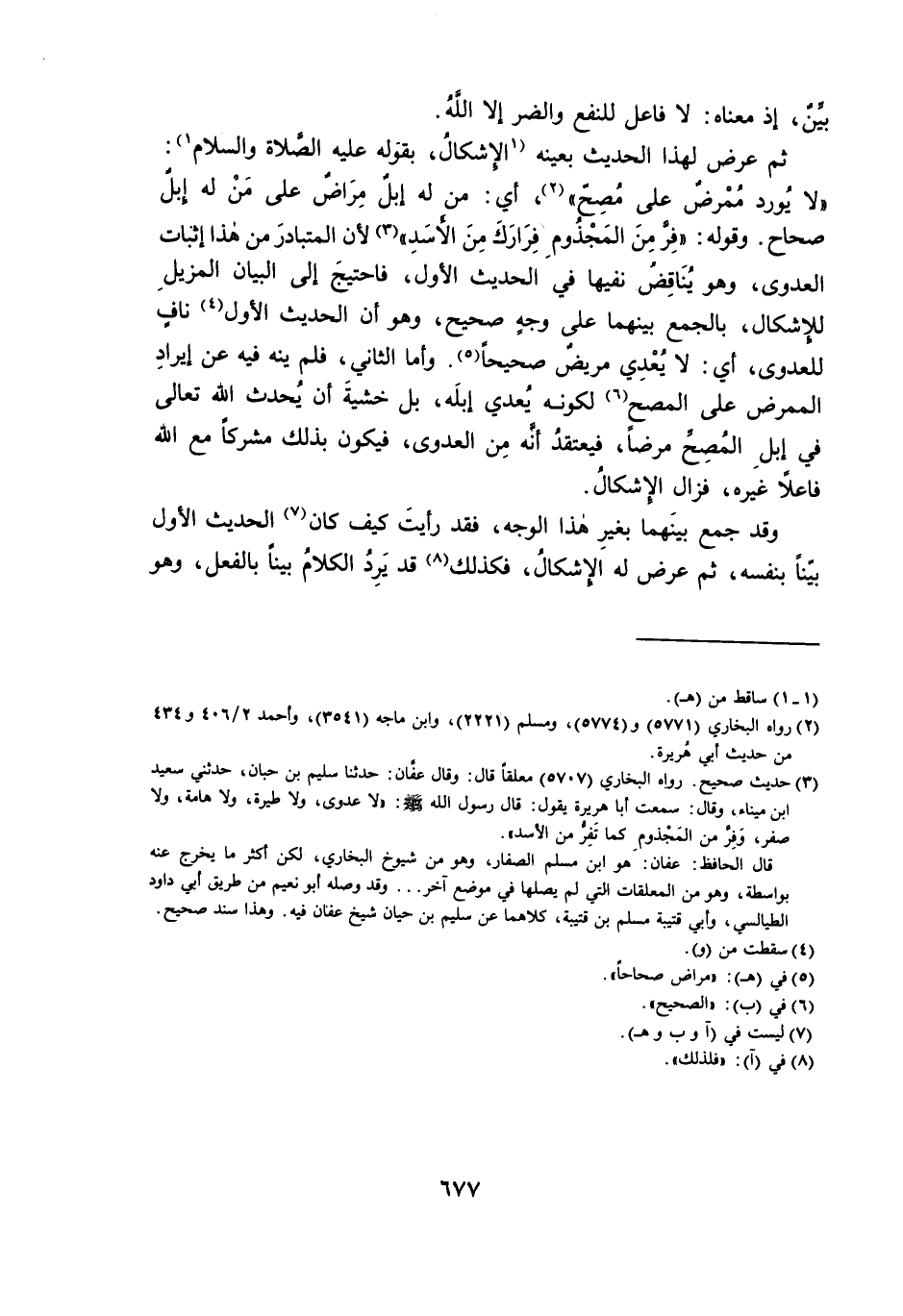 ثُمَّ عَرَضَ لِهَذَا الْحَدِيثِ بِعَيْنِهِ الْإِشْكَالُ، بِقَوْلِهِ عَلَيْهِ الصَّلَاةُ وَالسَّلَامُ: لَا يُورَدُ مُمْرِضٌ عَلَى مُصِحٍّ، أَيْ: مَنْ لَهُ إِبِلٌ مِرَاضٌ عَلَى مَنْ لَهُ إِبِلٌ صِحَاحٌ. وَقَوْلِهِ: فِرَّ مِنَ الْمَجْذُومِ فِرَارَكَ مِنَ الْأَسَدِ. لِأَنَّ الْمُتَبَادِرَ مِنْ هَذَا إِثْبَاتُ الْعَدْوَى، وَهُوَ يُنَاقِضُ نَفْيَهَا فِي الْحَدِيثِ الْأَوَّلِ ; فَاحْتِيجَ إِلَى بَيَانِ الْمُزِيلِ لِلْإِشْكَالِ، بِالْجَمْعِ بَيْنَهُمَا عَلَى وَجْهٍ صَحِيحٍ، وَهُوَ أَنَّ الْحَدِيثَ الْأَوَّلَ نَافٍ لِلْعَدْوَى، أَيْ: لَا يُعْدِي مَرِيضٌ صَحِيحًا، وَأَمَّا الثَّانِي، فَلَمْ يَنْهَ فِيهِ عَنْ إِيرَادِ الْمُمْرِضِ عَلَى الْمُصِحِّ لِكَوْنِهِ يُعْدِي الْإِبِلَ، بَلْ خَشْيَةَ أَنْ يُحْدِثَ اللَّهُ تَعَالَى فِي إِبِلٍ مُصِحٍّ مَرَضًا ; فَيَعْتَقَدَ أَنَّهُ مِنَ الْعَدْوَى ; فَيَكُونَ بِذَلِكَ مُشْرِكًا مَعَ اللَّهِ فَاعِلًا غَيْرَهُ ; فَزَالَ الْإِشْكَالُ.