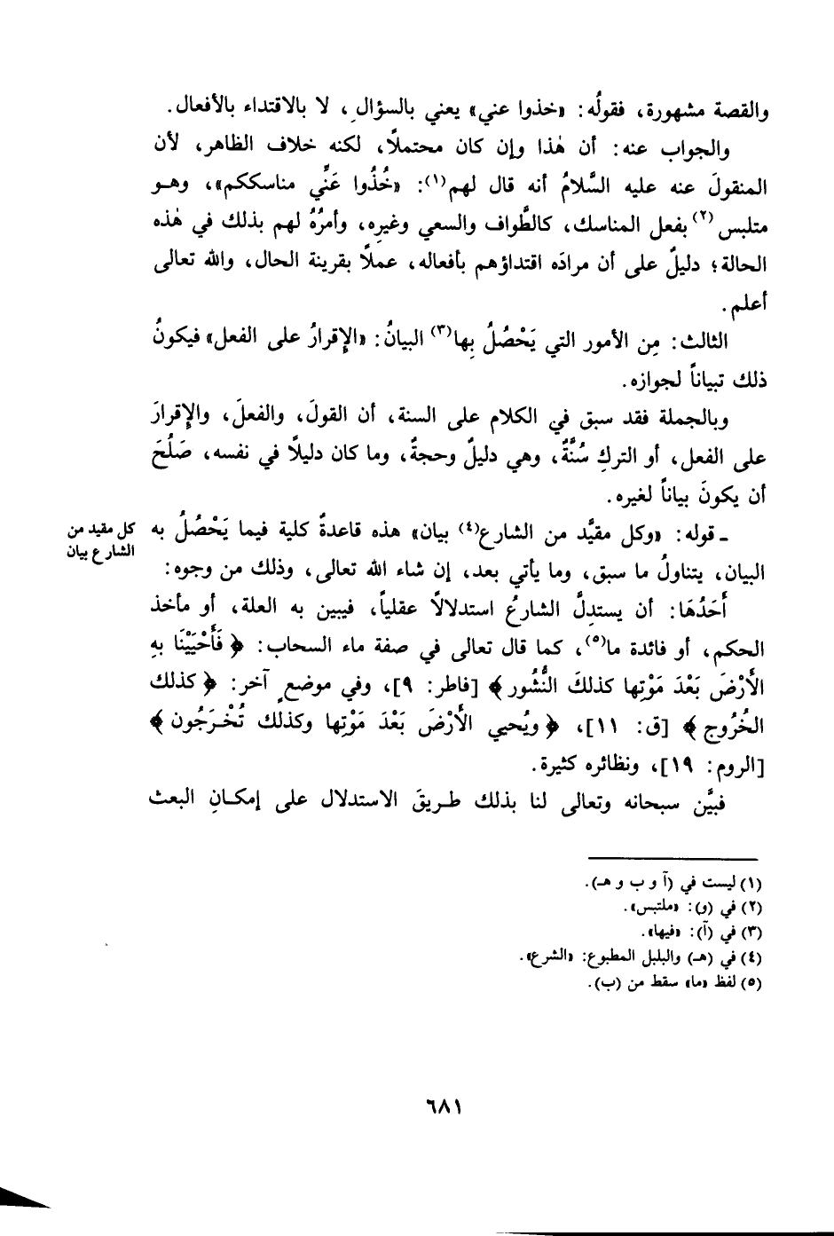 قَوْلُهُ: " وَكُلُّ مُقَيَّدٍ مِنَ الشَّارِعِ بَيَانٌ "، هَذِهِ قَاعِدَةٌ كُلِّيَّةٌ فِيمَا يَحْصُلُ بِهِ الْبَيَانُ، يَتَنَاوَلُ مَا سَبَقَ، وَمَا يَأْتِي بَعْدُ، إِنْ شَاءَ اللَّهُ تَعَالَى، وَذَلِكَ مِنْ وُجُوهٍ: