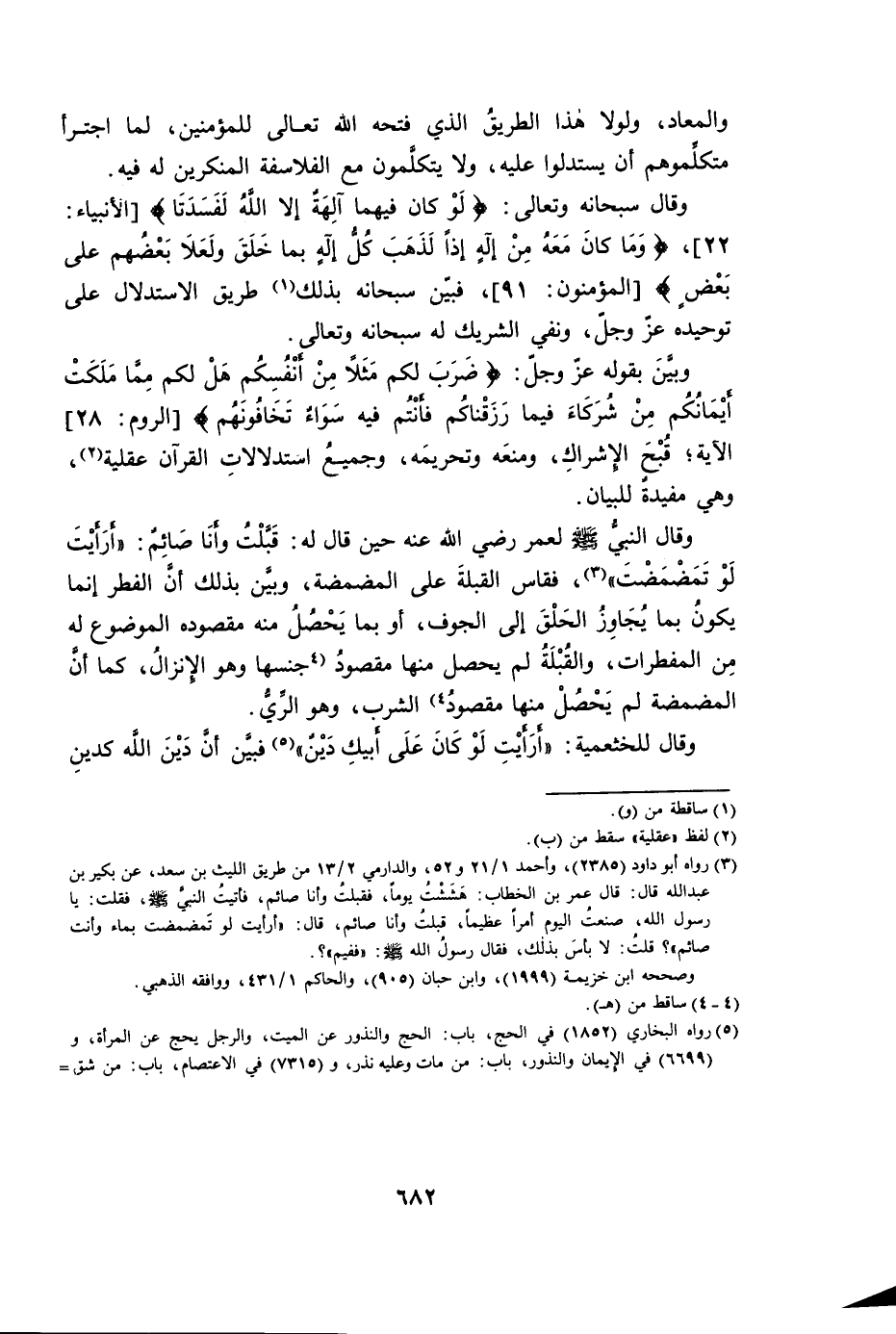 وَقَالَ النَّبِيُّ صَلَّى اللَّهُ عَلَيْهِ وَسَلَّمَ، لِعُمَرَ رَضِيَ اللَّهُ عَنْهُ حِينَ قَالَ لَهُ: قَبَّلْتُ وَأَنَا صَائِمٌ: أَرَأَيْتَ لَوْ تَمَضْمَضْتَ. فَقَاسَ الْقُبْلَةَ عَلَى الْمَضْمَضَةِ، وَبَيَّنَ بِذَلِكَ أَنَّ الْفِطْرَ إِنَّمَا يَكُونُ بِمَا يُجَاوِزُ الْحَلْقَ إِلَى الْجَوْفِ، أَوْ بِمَا يَحْصُلُ مِنْهُ مَقْصُودُهُ الْمَوْضُوعُ لَهُ مِنَ الْمُفَطِّرَاتِ، وَالْقُبْلَةُ لَمْ يَحْصُلْ مِنْهَا مَقْصُودُ جِنْسِهَا وَهُوَ الْإِنْزَالُ، كَمَا أَنَّ الْمَضْمَضَةَ لَمْ يَحْصُلْ مِنْهَا مَقْصُودُ الشُّرْبِ، وَهُوَ الرِّيُّ.