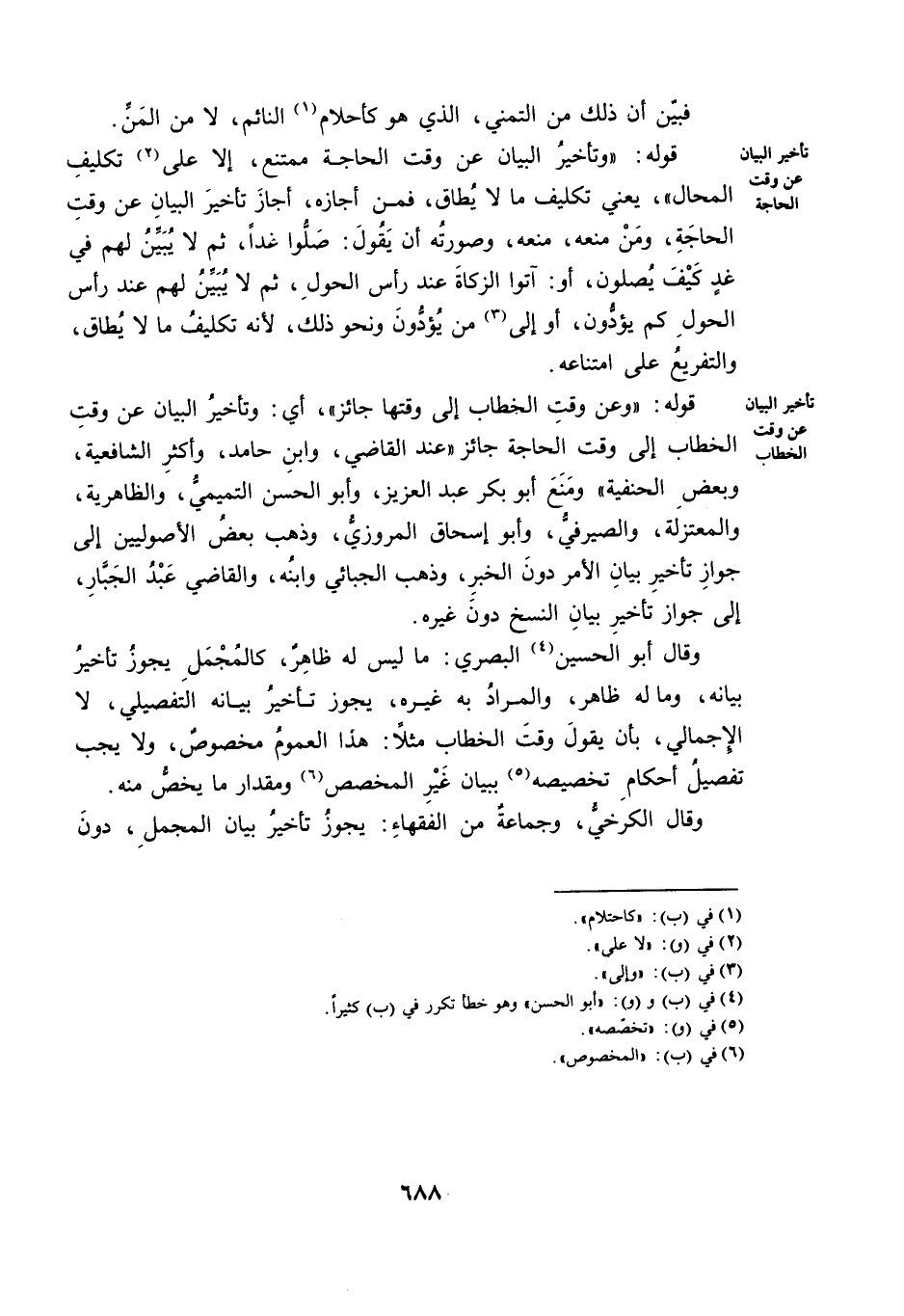 قَوْلُهُ: «وَتَأْخِيرُ الْبَيَانِ عَنْ وَقْتِ الْحَاجَةِ مُمْتَنِعٌ، إِلَّا عَلَى تَكْلِيفِ الْمُحَالِ» ، يَعْنِي تَكْلِيفَ مَا لَا يُطَاقُ ; فَمَنْ أَجَازَهُ، أَجَازَ تَأْخِيرَ الْبَيَانِ عَنْ وَقْتِ الْحَاجَةِ، وَمَنْ مَنْعَهُ، مَنَعَهُ، وَصُورَتُهُ أَنْ يَقُولَ: صَلُّوا غَدًا، ثُمَّ لَا يُبَيِّنُ لَهُمْ فِي غَدٍ كَيْفَ يُصَلُّونَ، أَوْ: آتَوُا الزَّكَاةَ عِنْدَ رَأْسِ الْحَوْلِ، ثُمَّ لَا يُبَيِّنُ لَهُمْ عِنْدَ رَأْسِ الْحَوْلِ كَمْ يُؤَدُّونَ، أَوْ إِلَى مَنْ يُؤَدُّونَ وَنَحْوُ ذَلِكَ ; لِأَنَّهُ تَكْلِيفُ مَا لَا يُطَاقُ، وَالتَّفْرِيعُ عَلَى امْتِنَاعِهِ.