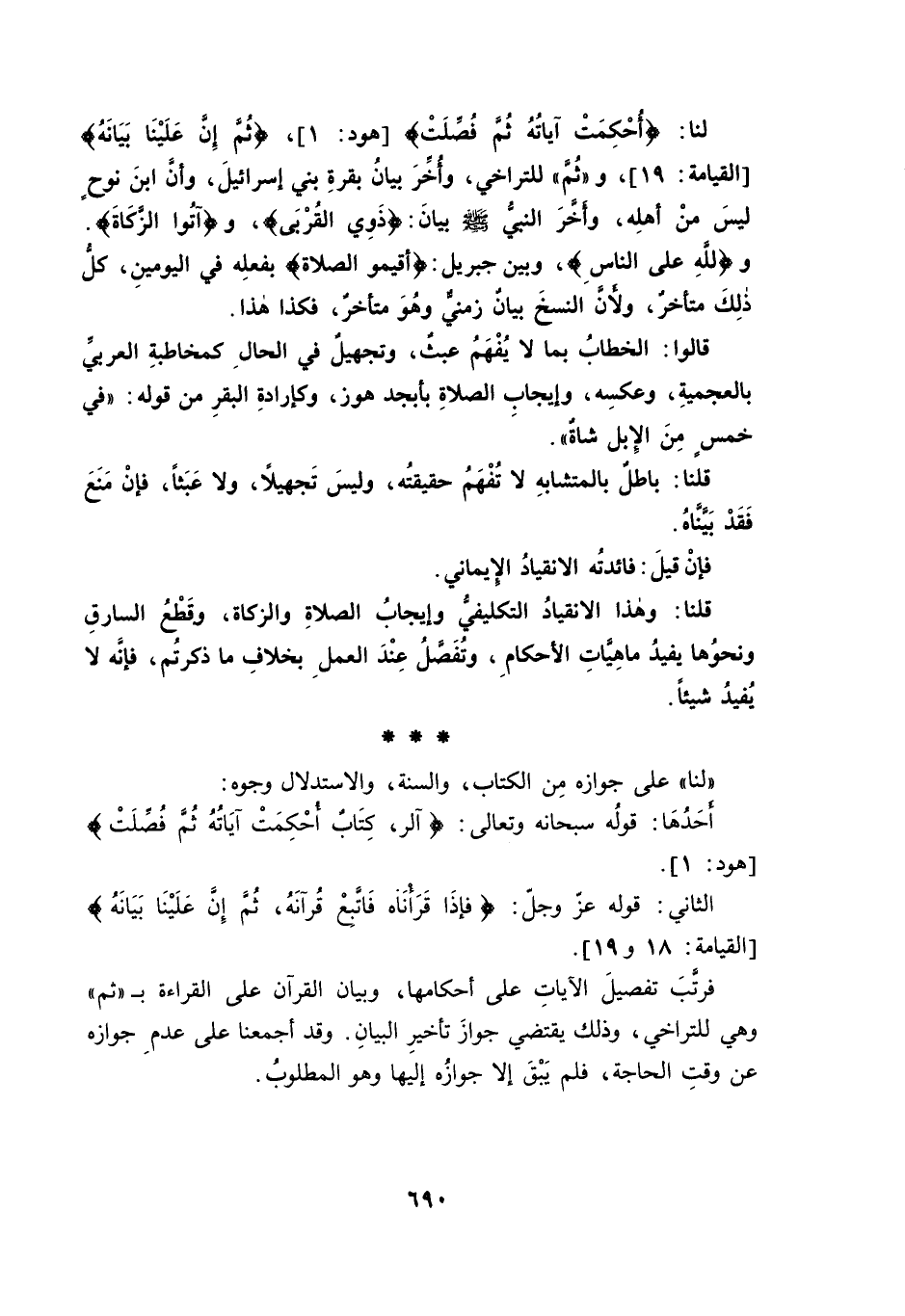 فَرَتَّبَ تَفْصِيلَ الْآيَاتِ عَلَى أَحْكَامِهَا، وَبَيَانَ الْقُرْآنِ عَلَى الْقِرَاءَةِ بِـ «ثُمَّ» وَهِيَ لِلتَّرَاخِي، وَذَلِكَ يَقْتَضِي جَوَازَ تَأْخِيرِ الْبَيَانِ. وَقَدْ أَجْمَعْنَا عَلَى عَدَمِ جَوَازِهِ عَنْ وَقْتِ الْحَاجَةِ، فَلَمْ يَبْقَ إِلَّا جَوَازُهُ إِلَيْهَا وَهُوَ الْمَطْلُوبُ.