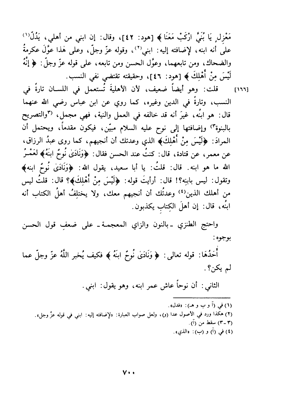 قُلْتُ: وَهُوَ أَيْضًا ضَعِيفٌ ; لِأَنَّ الْأَهْلِيَّةَ تُسْتَعْمَلُ فِي اللِّسَانِ تَارَةً فِي النَّسَبِ، وَتَارَةً فِي الدِّينِ وَغَيْرِهِ، كَمَا رُوِيَ عَنِ ابْنِ عَبَّاسٍ رَضِيَ اللَّهُ عَنْهُمَا قَالَ: هُوَ ابْنُهُ، غَيْرَ أَنَّهُ قَدْ خَالَفَهُ فِي الْعَمَلِ وَالنِّيَّةِ ; فَهِيَ مُجْمَلٌ، وَالتَّصْرِيحُ بِالْبُنُوَّةِ، وَإِضَافَتُهَا لِنُوحٍ عَلَيْهِ السَّلَامُ مُبَيِّنٌ ; فَيَكُونُ مُقَدَّمًا، وَيُحْتَمَلُ أَنَّ الْمُرَادَ: {لَيْسَ مِنْ أَهْلِكَ} الَّذِي وَعَدْتُكَ أَنْ أُنْجِيَهُمْ، كَمَا رَوَى عَبْدُ الرَّزَّاقِ، عَنْ مَعْمَرٍ، عَنْ قَتَادَةَ، قَالَ: كُنْتُ عِنْدَ الْحَسَنِ فَقَالَ: {وَنَادَى نُوحٌ ابْنَهُ} وَتَقُولُ: لَيْسَ بِابْنِهِ؟ قَالَ: أَرَأَيْتَ قَوْلَهُ: {لَيْسَ مِنْ أَهْلِكَ} ؟ قَالَ: قُلْتُ لَيْسَ مِنْ أَهْلِكَ الَّذِينَ وَعَدْتُكَ أَنْ أُنْجِيَهُمْ مَعَكَ، وَلَا يَخْتَلِفُ أَهْلُ الْكِتَابِ أَنَّهُ ابْنُهُ، قَالَ: إِنَّ أَهْلَ الْكِتَابِ يَكْذِبُونَ.