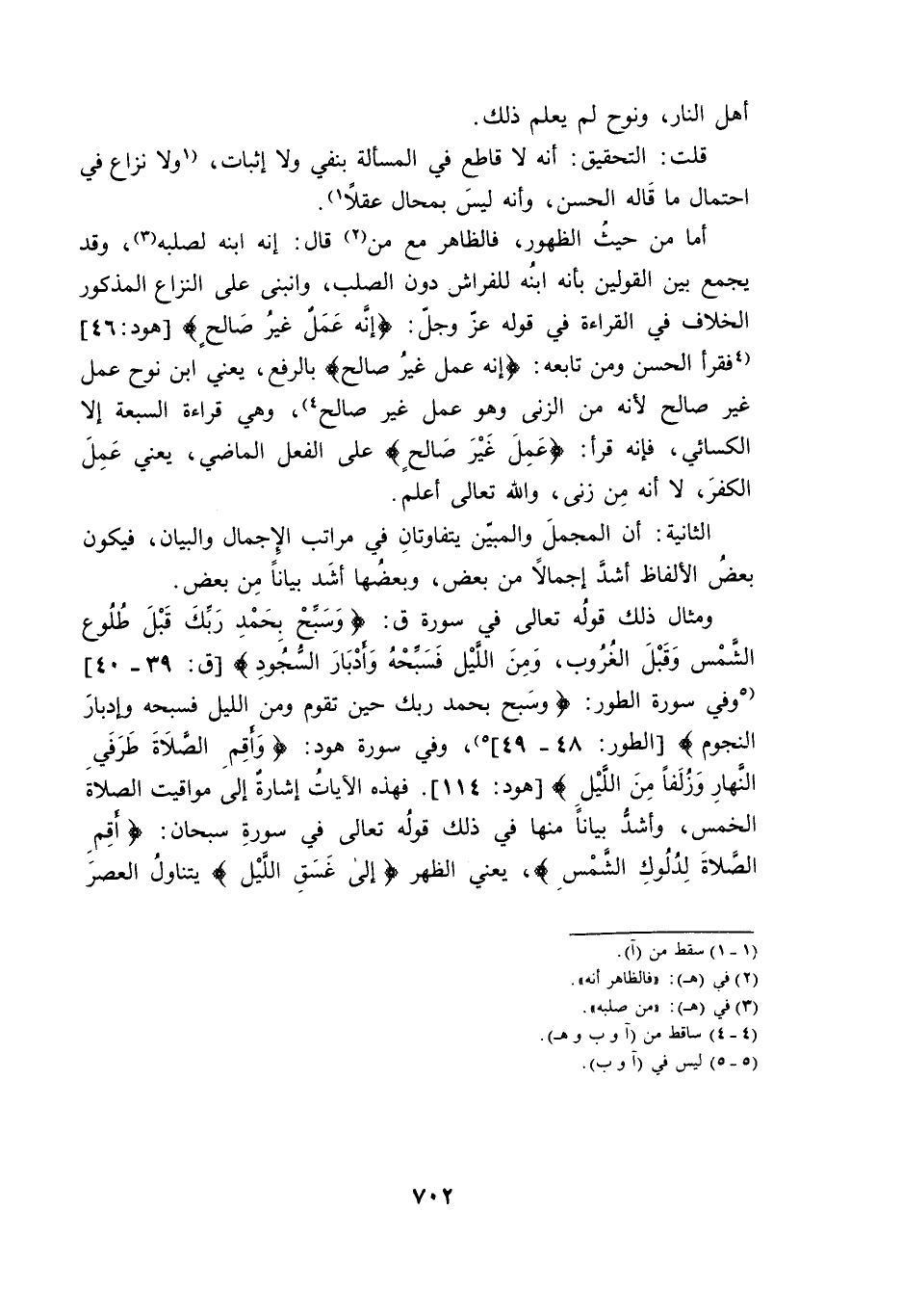 أَمَّا مِنْ حَيْثُ الظُّهُورُ ; فَالظَّاهِرُ مَعَ مَنْ قَالَ: إِنَّهُ ابْنُهُ لِصُلْبِهِ، وَقَدْ يُجْمَعُ بَيْنَ الْقَوْلَيْنِ بِأَنَّهُ ابْنُهُ لِلْفِرَاشِ دُونَ الصُّلْبِ، وَانْبَنَى عَلَى النِّزَاعِ الْمَذْكُورِ الْخِلَافُ فِي الْقِرَاءَةِ فِي قَوْلِهِ عَزَّ وَجَلَّ: {إِنَّهُ عَمَلٌ غَيْرُ صَالِحٍ} [هُودٍ: 46] فَقَرَأَ الْحَسَنُ وَمَنْ تَابَعَهُ: {إِنَّهُ عَمَلٌ غَيْرُ صَالِحٍ} بِالرَّفْعِ، يَعْنِي: ابْنُ نُوحٍ عَمَلٌ غَيْرُ صَالِحٍ؛ لِأَنَّهُ مِنَ الزِّنَا وَهُوَ عَمَلٌ غَيْرُ صَالِحٍ، وَهِيَ قِرَاءَةُ السَّبْعَةِ إِلَّا الْكِسَائِيَّ ; فَإِنَّهُ قَرَأَ: عَمِلَ غَيْرَ صَالِحٍ عَلَى الْفِعْلِ الْمَاضِي، يَعْنِي عَمِلَ الْكُفْرَ، لَا أَنَّهُ مِنْ زِنَا، وَاللَّهُ تَعَالَى أَعْلَمُ.