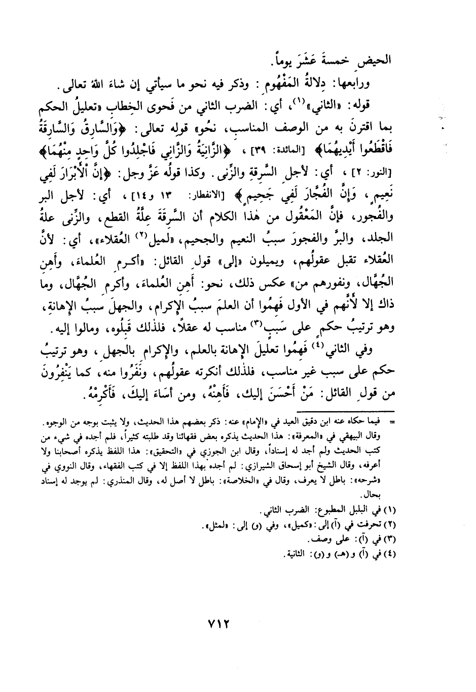 قَوْلُهُ: «الثَّانِي» ، أَيِ: الضَّرْبُ الثَّانِي مِنْ فَحْوَى الْخِطَابِ - «تَعْلِيلُ الْحُكْمِ بِمَا اقْتَرَنَ بِهِ مِنَ الْوَصْفِ الْمُنَاسِبِ، نَحْوَ» قَوْلِهِ تَعَالَى: {وَالسَّارِقُ وَالسَّارِقَةُ فَاقْطَعُوا أَيْدِيَهُمَا} [الْمَائِدَةِ: 39] ، {الزَّانِيَةُ وَالزَّانِي فَاجْلِدُوا كُلَّ وَاحِدٍ مِنْهُمَا} [النُّورِ: 2] ، أَيْ: لِأَجْلِ السَّرِقَةِ وَالزِّنَا. وَكَذَا قَوْلُهُ عَزَّ وَجَلَّ: {إِنَّ الْأَبْرَارَ لَفِي نَعِيمٍ وَإِنَّ الْفُجَّارَ لَفِي جَحِيمٍ} [الِانْفِطَارِ: 13، 14] ، أَيْ: لِأَجْلِ الْبِرِّ وَالْفُجُورِ، فَإِنَّ الْمَعْقُولَ مِنْ هَذَا الْكَلَامِ أَنَّ السَّرِقَةَ عِلَّةُ الْقَطْعِ، وَالزِّنَا عِلَّةُ الْجَلْدِ، وَالْبِرَّ وَالْفُجُورَ سَبَبُ النَّعِيمِ وَالْجَحِيمِ، «لِمَيْلِ الْعُقَلَاءِ» ، أَيْ: لِأَنَّ الْعُقَلَاءَ تَقْبَلُ عُقُولُهُمْ، وَيَمِيلُونَ «إِلَى» قَوْلِ الْقَائِلِ: «أَكْرِمِ الْعُلَمَاءَ، وَأَهِنِ الْجُهَّالَ، وَنُفُورِهِمْ مِنْ» عَكْسِ ذَلِكَ، نَحْوَ: أَهِنِ الْعُلَمَاءَ، وَأَكْرِمِ الْجُهَّالَ، وَمَا ذَاكَ إِلَّا لِأَنَّهُمْ فِي الْأَوَّلِ فَهِمُوا أَنَّ الْعِلْمَ سَبَبُ الْإِكْرَامِ، وَالْجَهْلَ سَبَبُ الْإِهَانَةِ، وَهُوَ تَرْتِيبُ حُكْمٍ عَلَى سَبَبٍ مُنَاسِبٍ لَهُ عَقْلًا ; فَلِذَلِكَ قَبِلُوهُ، وَمَالُوا إِلَيْهِ.