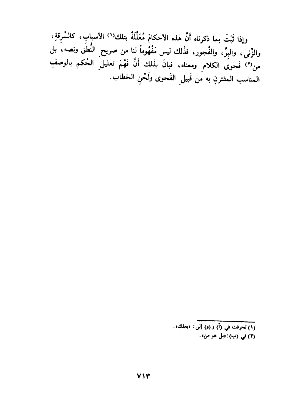 وَإِذَا ثَبَتَ بِمَا ذَكَرْنَاهُ أَنَّ هَذِهِ الْأَحْكَامَ مُعَلَّلَةٌ بِتِلْكَ الْأَسْبَابِ، كَالسَّرِقَةِ، وَالزِّنَا، وَالْبِرِّ، وَالْفُجُورِ ; فَذَلِكَ لَيْسَ مَفْهُومًا لَنَا مِنْ صَرِيحِ النُّطْقِ وَنَصِّهِ، بَلْ مِنْ فَحْوَى الْكَلَامِ وَمَعْنَاهُ ; فَبَانَ بِذَلِكَ أَنْ فَهْمَ تَعْلِيلِ الْحُكْمِ بِالْوَصْفِ الْمُنَاسِبِ الْمُقْتَرِنِ بِهِ مِنْ قَبِيلِ الْفَحْوَى وَلَحْنِ الْخِطَابِ.
