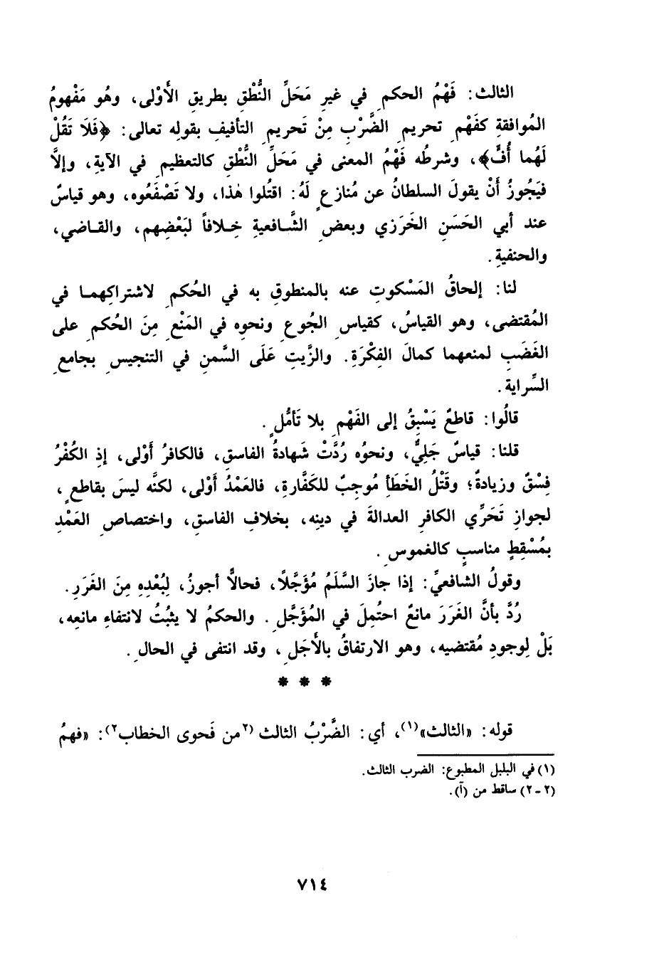 الثَّالِثُ: فَهْمُ الْحُكْمِ فِي غَيْرِ مَحَلِّ النُّطْقِ بِطَرِيقِ الْأَوْلَى، وَهُوَ مَفْهُومُ الْمُوَافَقَةِ كَفَهْمِ تَحْرِيمِ الضَّرْبِ مِنْ تَحْرِيمِ التَّأْفِيفِ بِقَوْلِهِ تَعَالَى: {فَلَا تَقُلْ لَهُمَا أُفٍّ} وَشَرْطُهُ فَهْمُ الْمَعْنَى فِي مَحَلِّ النُّطْقِ كَالتَّعْظِيمِ فِي الْآيَةِ، وَإِلَّا فَيَجُوزُ أَنْ يَقُولَ السُّلْطَانُ عَنْ مُنَازِعٍ لَهُ: اقْتُلُوا هَذَا، وَلَا تَصْفَعُوهُ، وَهُوَ قِيَاسٌ عِنْدَ أَبِي الْحَسَنِ الْخَرَزِيِّ وَبَعْضِ الشَّافِعِيَّةِ خِلَافًا لِبَعْضِهِمْ، وَالْقَاضِي، وَالْحَنَفِيَّةِ.