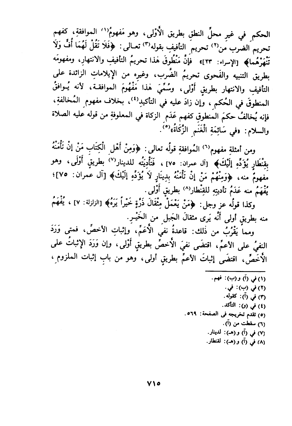 الْحُكْمِ فِي غَيْرِ مَحَلِّ النُّطْقِ بِطَرِيقِ الْأَوْلَى، وَهُوَ مَفْهُومُ الْمُوَافَقَةِ، كَفَهْمِ تَحْرِيمِ الضَّرْبِ مِنْ تَحْرِيمِ التَّأْفِيفِ بِقَوْلِهِ تَعَالَى: {فَلَا تَقُلْ لَهُمَا أُفٍّ وَلَا تَنْهَرْهُمَا} [الْإِسْرَاءِ: 23] » ، فَإِنَّ مَنْطُوقَ هَذَا تَحْرِيمُ التَّأْفِيفِ وَالِانْتِهَارِ، وَمَفْهُومَهُ بِطَرِيقِ التَّنْبِيهِ وَالْفَحْوَى تَحْرِيمُ الضَّرْبِ وَغَيْرِهِ مِنَ الْإِيلَامَاتِ الزَّائِدَةِ عَلَى التَّأْفِيفِ وَالِانْتِهَارِ بِطَرِيقِ أَوْلَى، وَسُمِّيَ هَذَا مَفْهُومَ الْمُوَافَقَةِ ; لِأَنَّهُ يُوَافِقُ الْمَنْطُوقَ فِي الْحُكْمِ، وَإِنْ زَادَ عَلَيْهِ فِي التَّأْكِيدِ، بِخِلَافِ مَفْهُومِ الْمُخَالَفَةِ ; فَإِنَّهُ يُخَالِفُ حُكْمَ الْمَنْطُوقِ كَفَهْمِ عَدَمِ الزَّكَاةِ فِي الْمَعْلُوفَةِ مِنْ قَوْلِهِ عَلَيْهِ الصَّلَاةُ وَالسَّلَامُ: فِي سَائِمَةِ الْغَنَمِ الزَّكَاةُ.